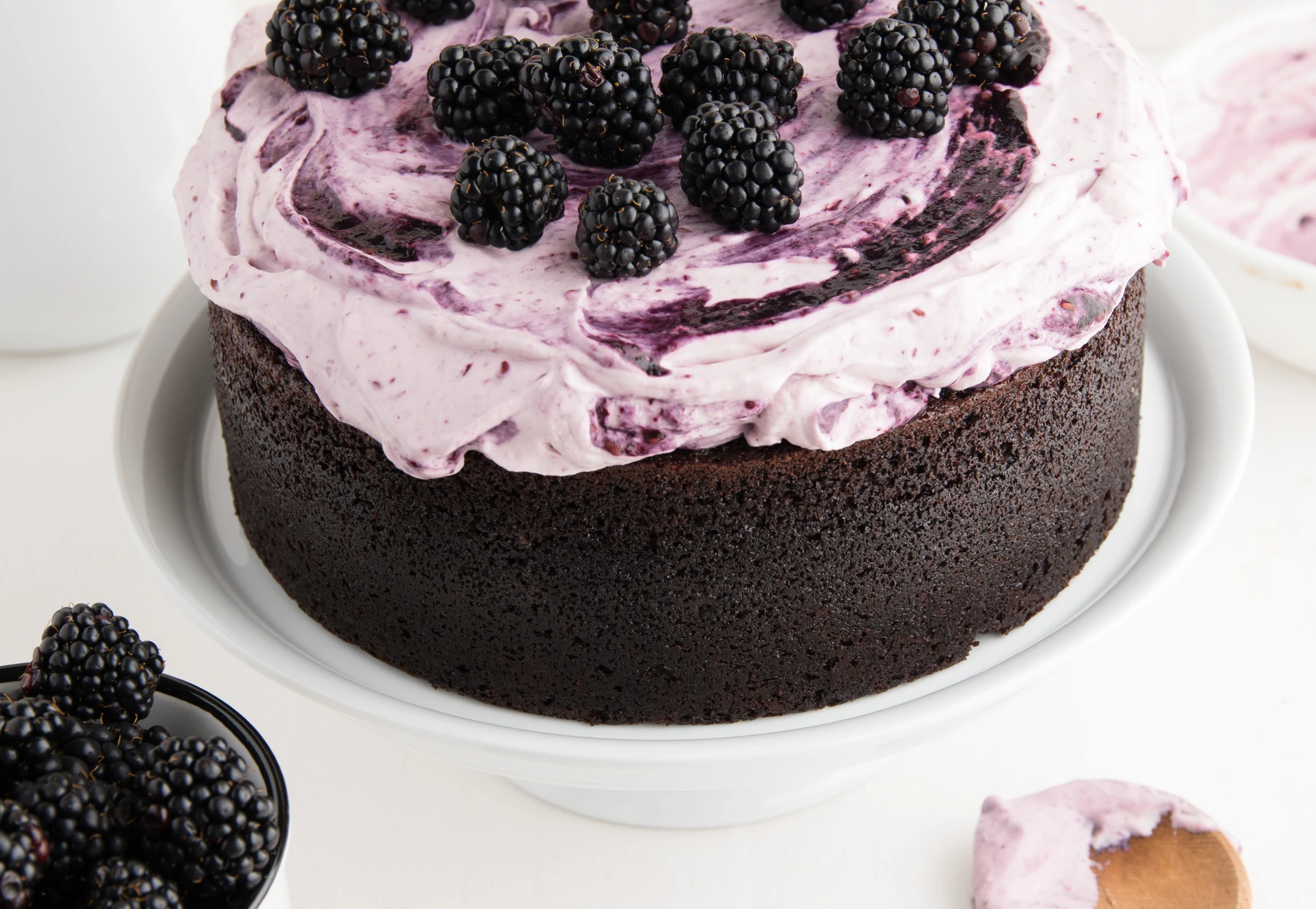 Creme auf dem Kuchen verstreichen und mit den Brombeeren belegen.