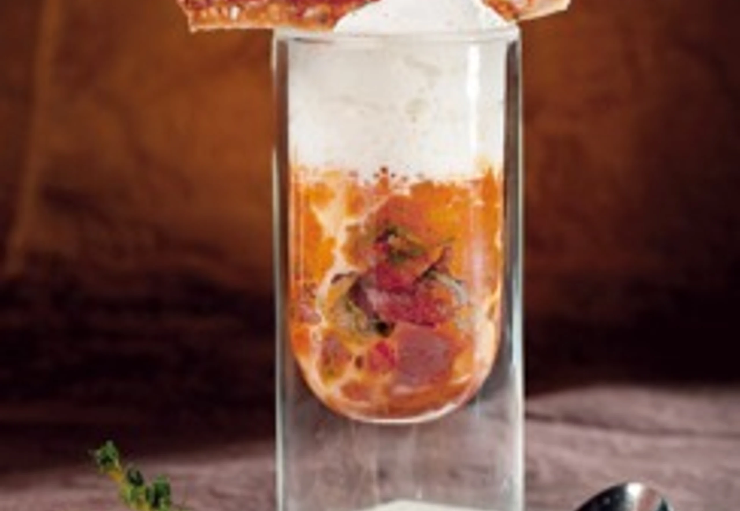 - Gulaschsuppe über das marinierte Fleisch gießen, Speckschaum darauf dressieren und mit den Chips garniert servieren.