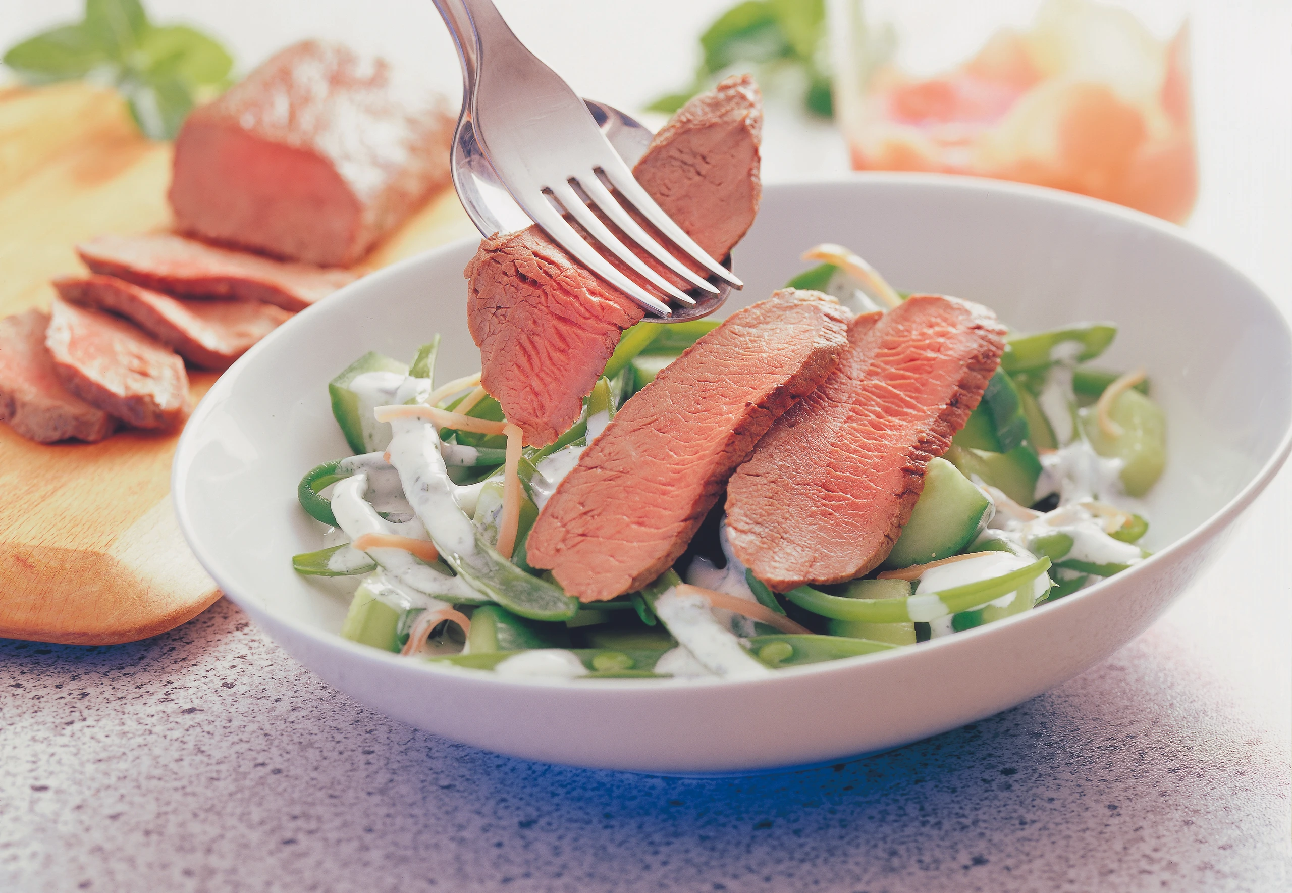 Gurken-Fisolensalat auf Tellern verteilen. Lammfilets in dünne Scheiben schneiden, auf dem Salat anrichten und mit Ingwer bestreut servieren.