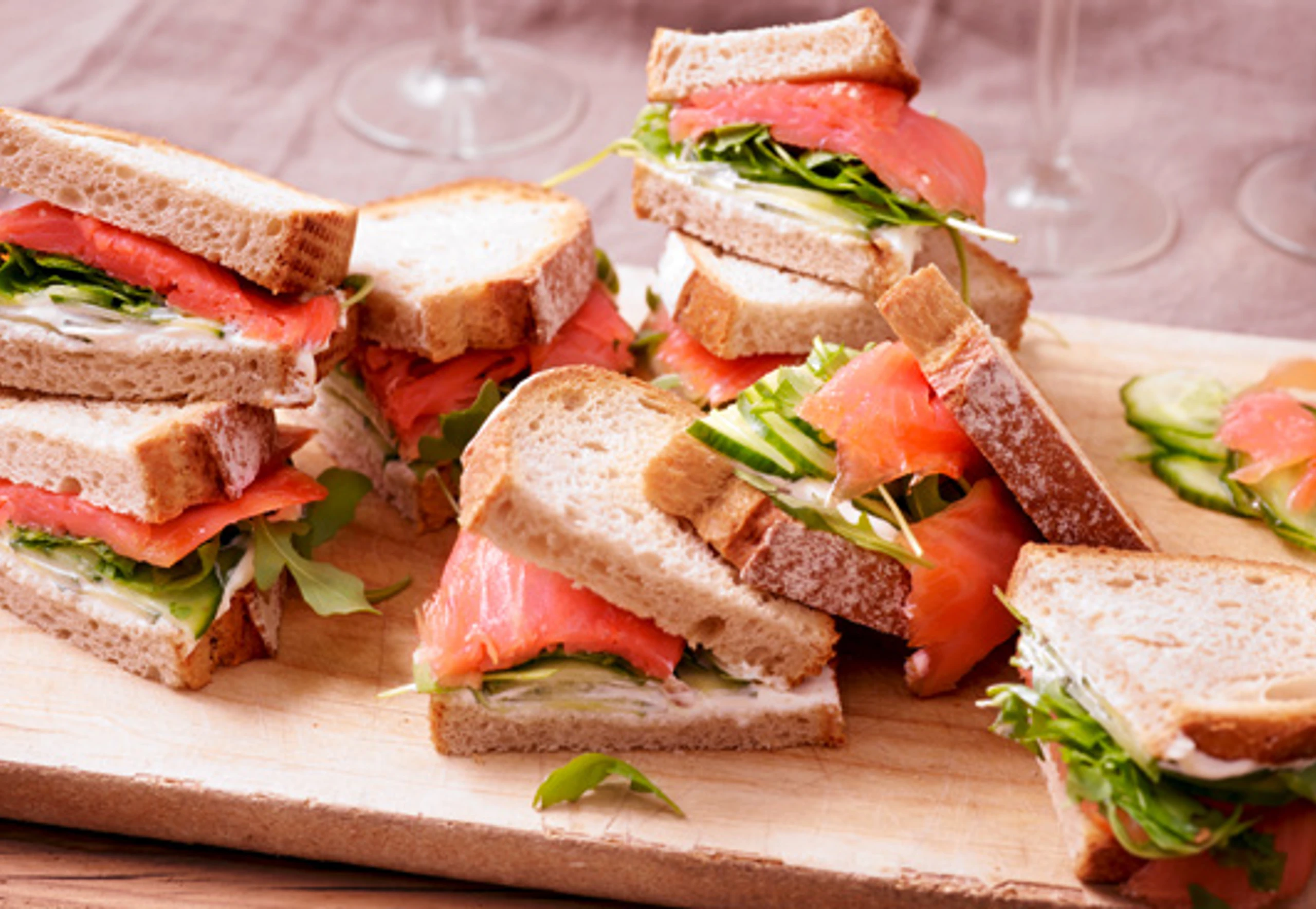 - Brote mit der Creme bestreichen, die Hälfte davon mit Gurken- und Lachsscheiben belegen. Rucola darauf verteilen, mit einer zweiten Brotscheibe bedecken. Brote leicht andrücken und in der Mitte durchschneiden.