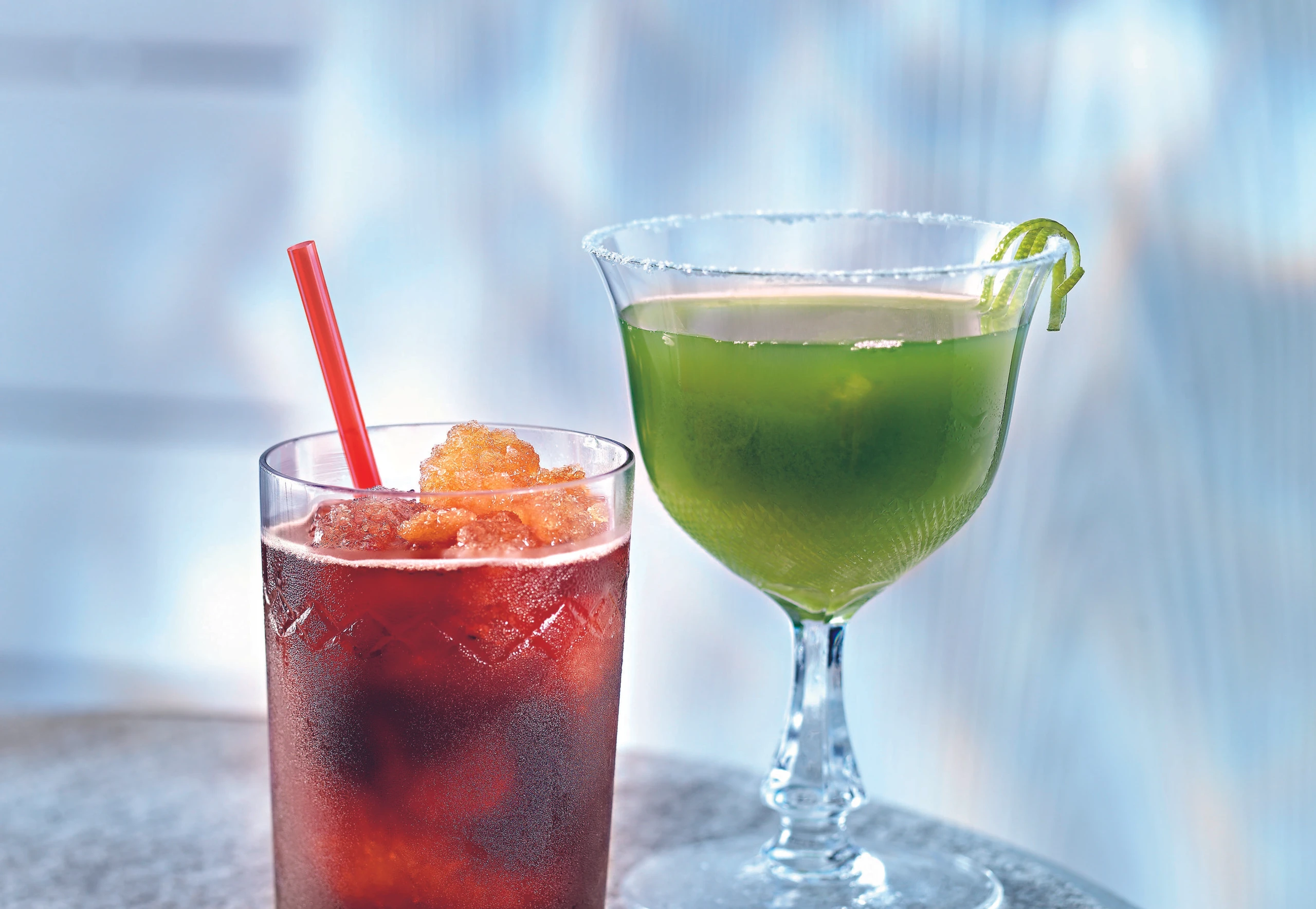 Den Rand der Gläser mit Wasser benetzen, Glasränder in Salz drücken, so dass ein dünner Salzrand entsteht. Gurkenwasser einfüllen.
