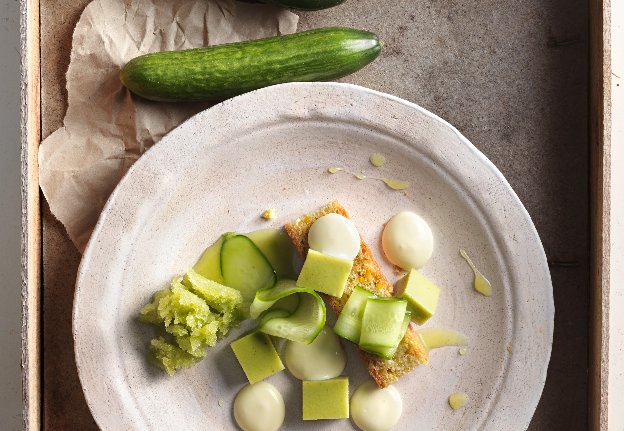 - Kuchen in 16 Stücke schneiden. Gurkencreme aus der Form stürzen und in Würfel schneiden. Kuchen, Gurkencreme und marinierte Gurken anrichten. Zitruscreme in einen Dressiersack (glatte Tülle) füllen und punktförmig aufdressieren. Granité mit einem Löffel abschaben. Dessert mit Granité garniert servieren.