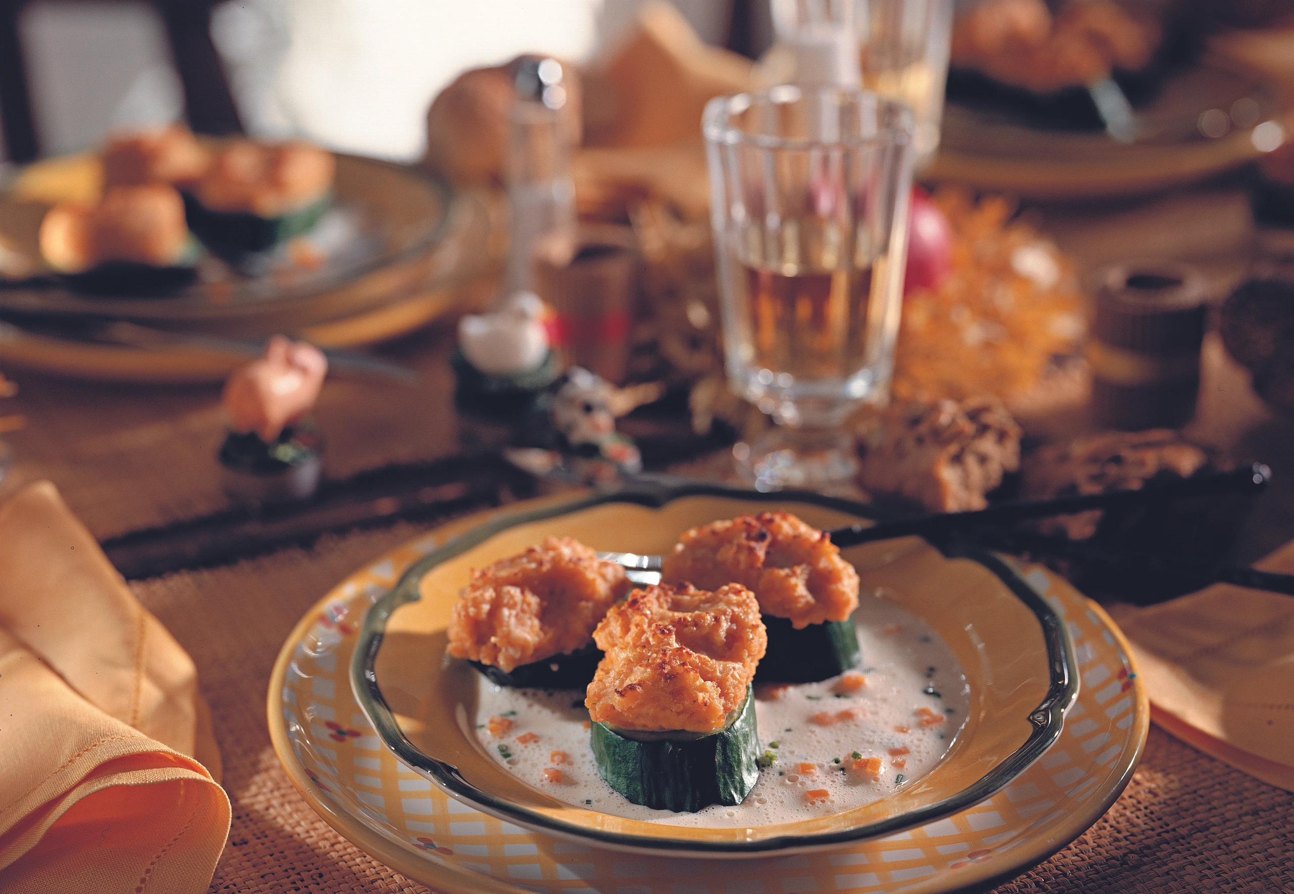 Inzwischen Gurke waschen und die Enden wegschneiden. Gurke in ca. 2 cm dicke Scheiben schneiden, mit einem kleinen Löffel oder Ausstecher ein wenig aushöhlen, in leicht gesalzenem Wasser ca. 1 Minute überkochen, kalt abschrecken und auf einem Küchentuch, Öffnung nach unten, gut abtropfen lassen.