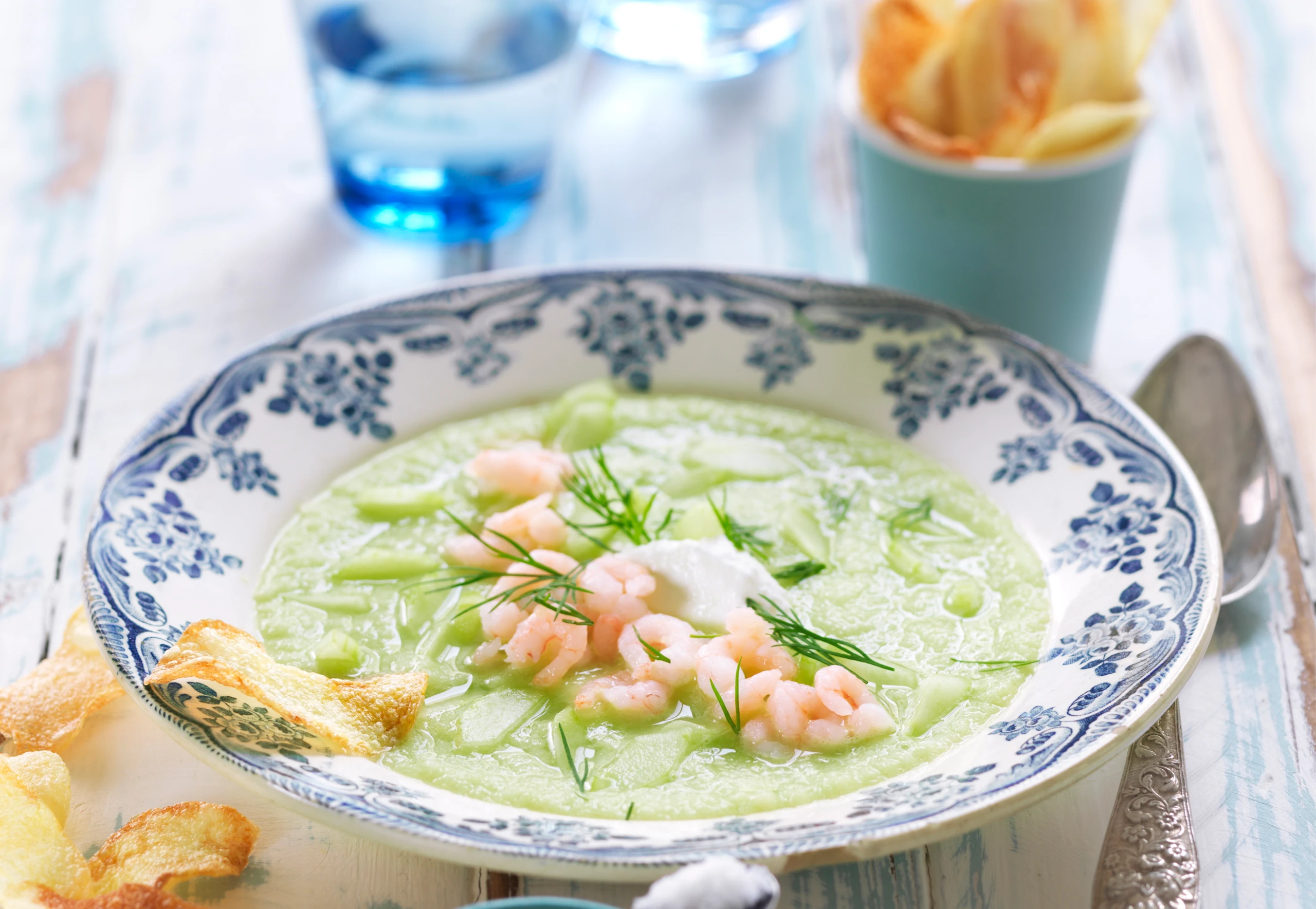 Dille hacken. Suppe in Teller gießen, Gurkenstücke und Krabben einlegen. Suppe mit Sauerrahm und Dille garnieren.