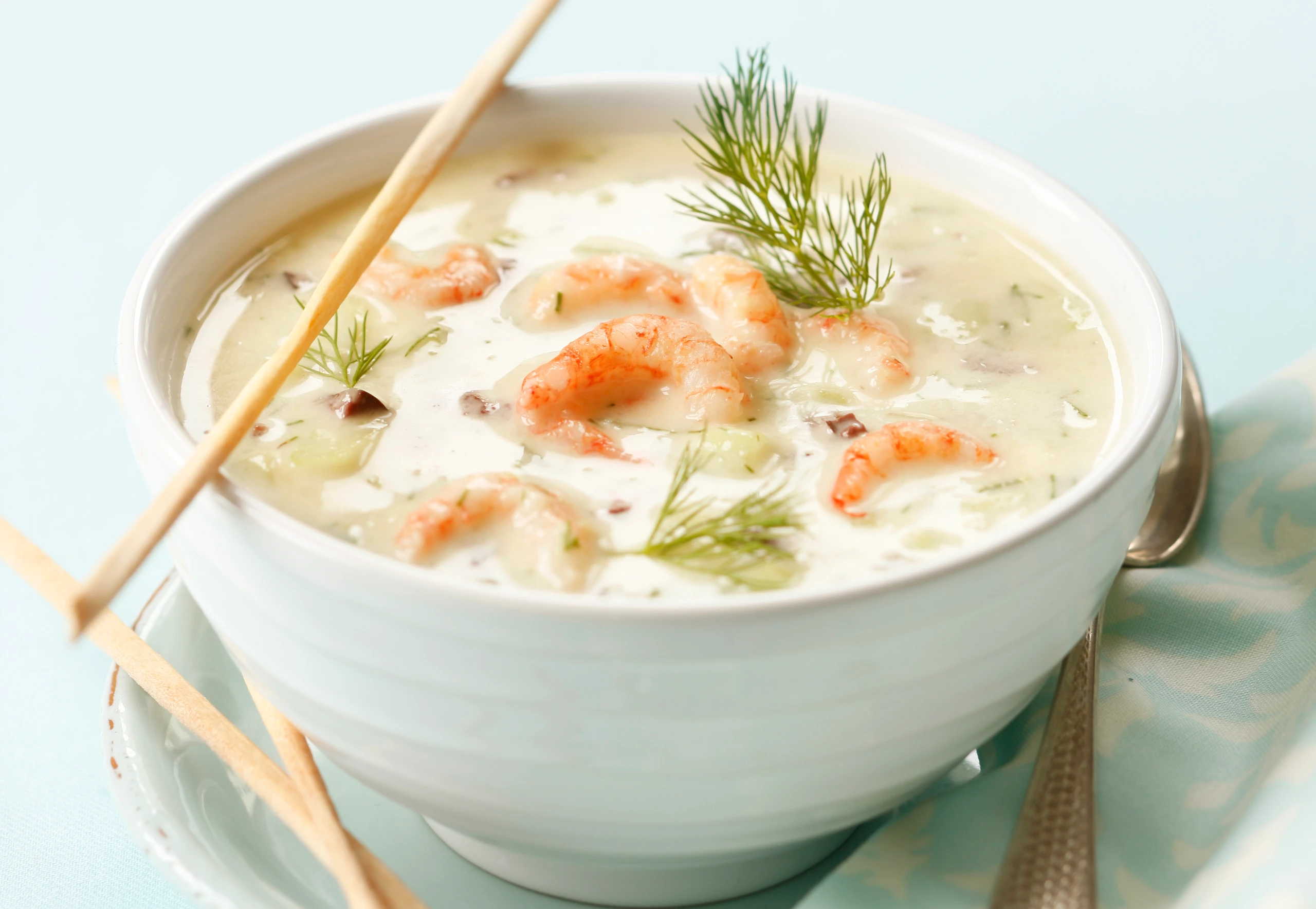 - Shrimps, Dille, Oliven und Gurkenwürfel in die Suppe rühren. Suppe mit Salz und Pfeffer würzen, anrichten und mit Grissini garniert servieren.
