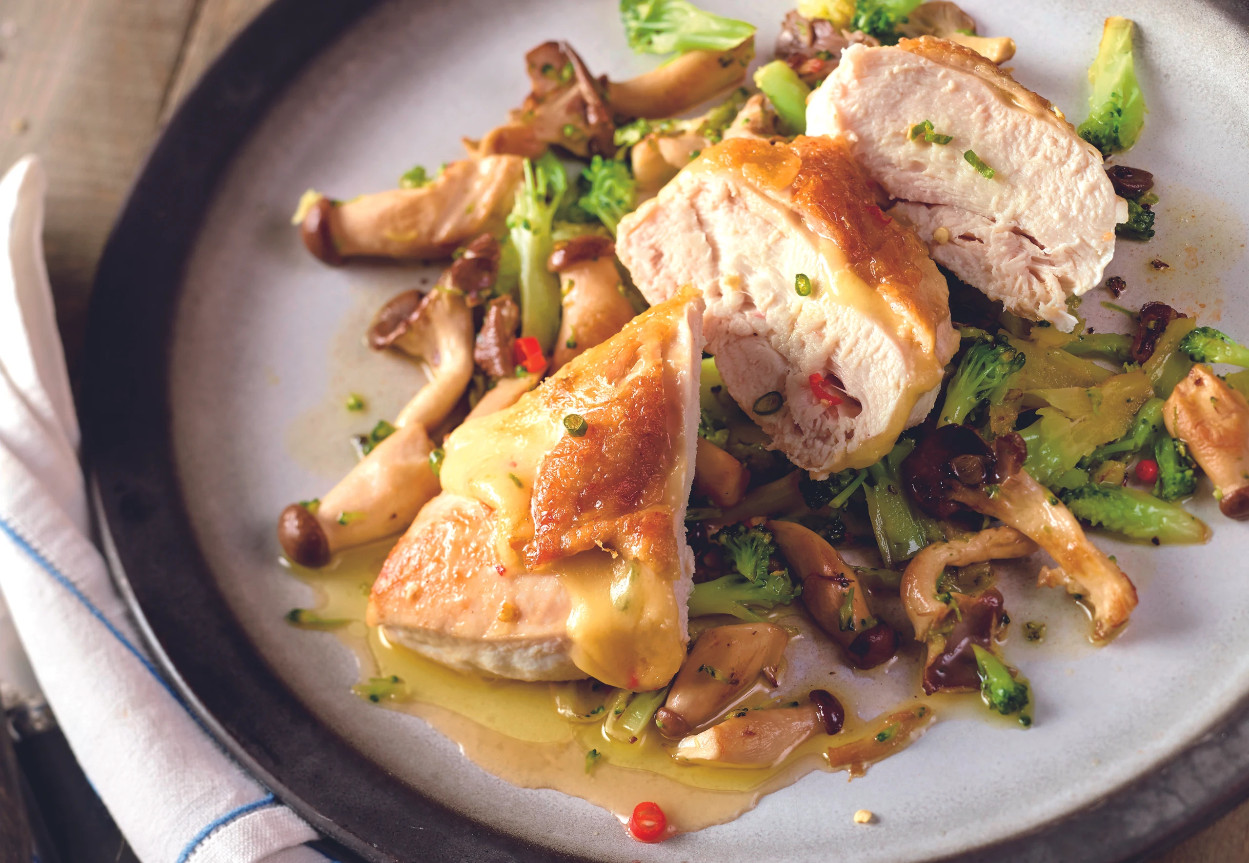 Hühnerfilets aus dem Rohr nehmen und in Scheiben schneiden, mit dem Pilz-Brokkoli-Gemüse servieren.