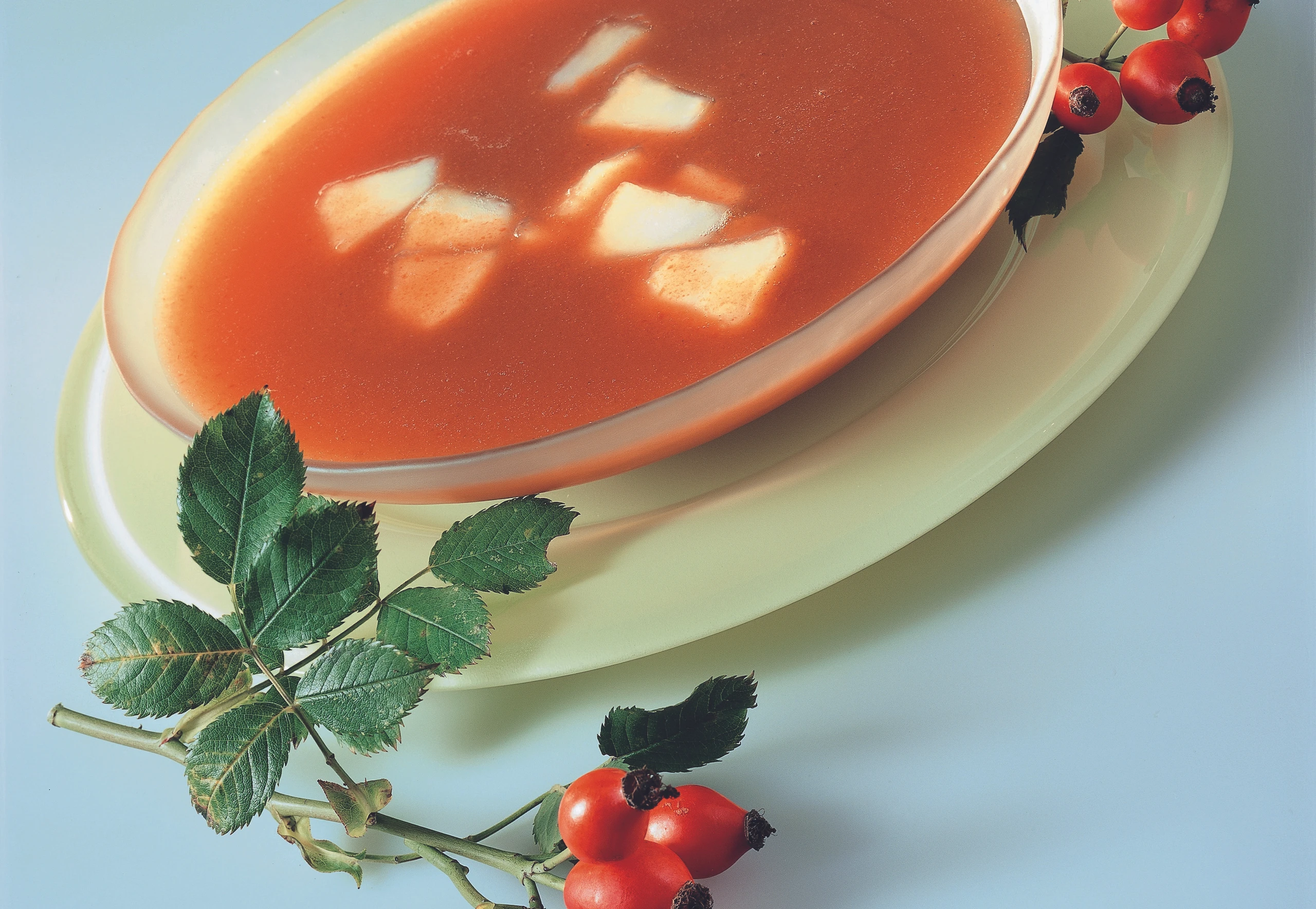 Hagebuttenmus mit Kristallzucker verrühren und leicht erwärmen. Apfelmus und Apfelstücke untermischen. Die Hagebuttensuppe kann man sowohl warm als auch kalt servieren.