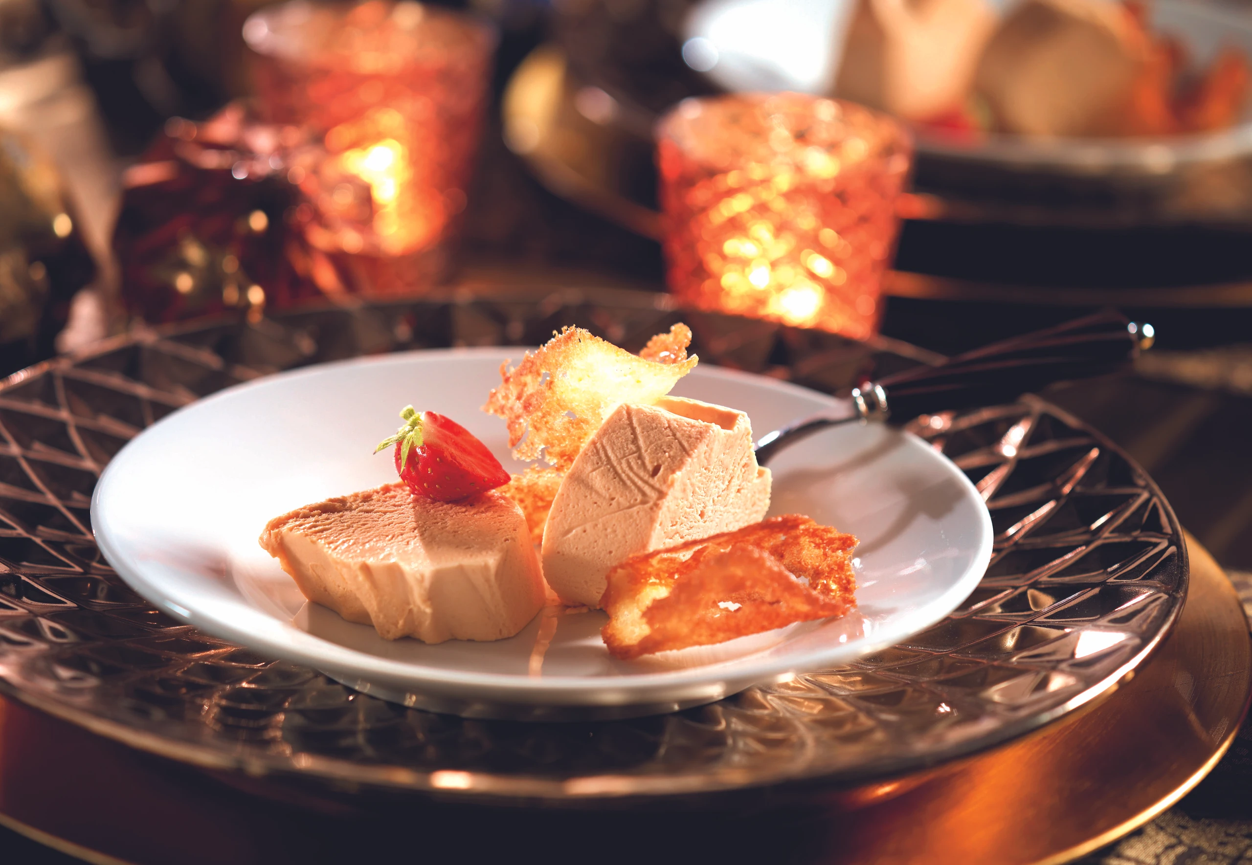 - Für die Garnitur Erdbeeren halbieren. Parfait aus der Form stürzen und die Folie abziehen. Parfait in Stücke schneiden, mit Hippen und Erdbeeren garnieren.