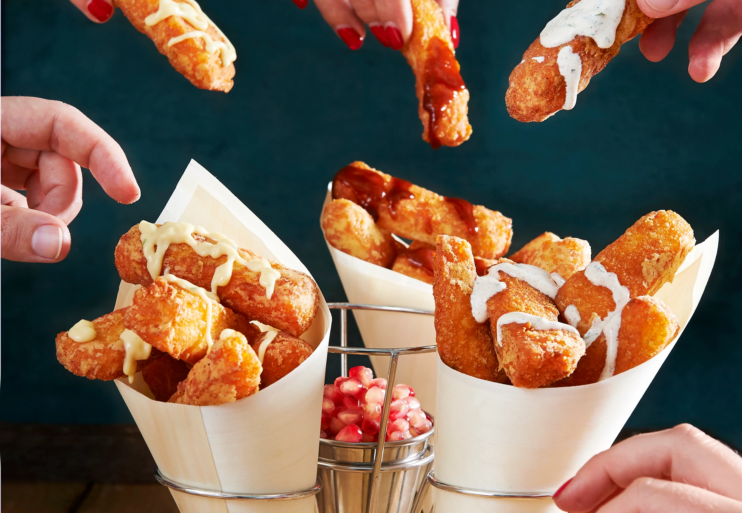Halloumi-Sticks mit einem Gitterlöffel herausheben, auf Küchenpapier abtropfen lassen, mit den Saucen anrichten und mit den Granatapfelkernen servieren.