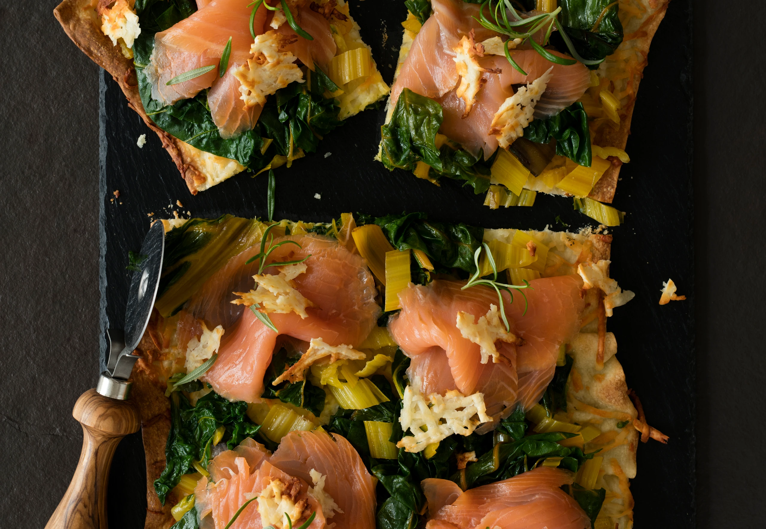 Kuchen aus dem Rohr nehmen, Mangold und Lachs darauf verteilen, mit knusprigem Halloumi und Rosmarin bestreuen. Kuchen portionieren und anrichten.