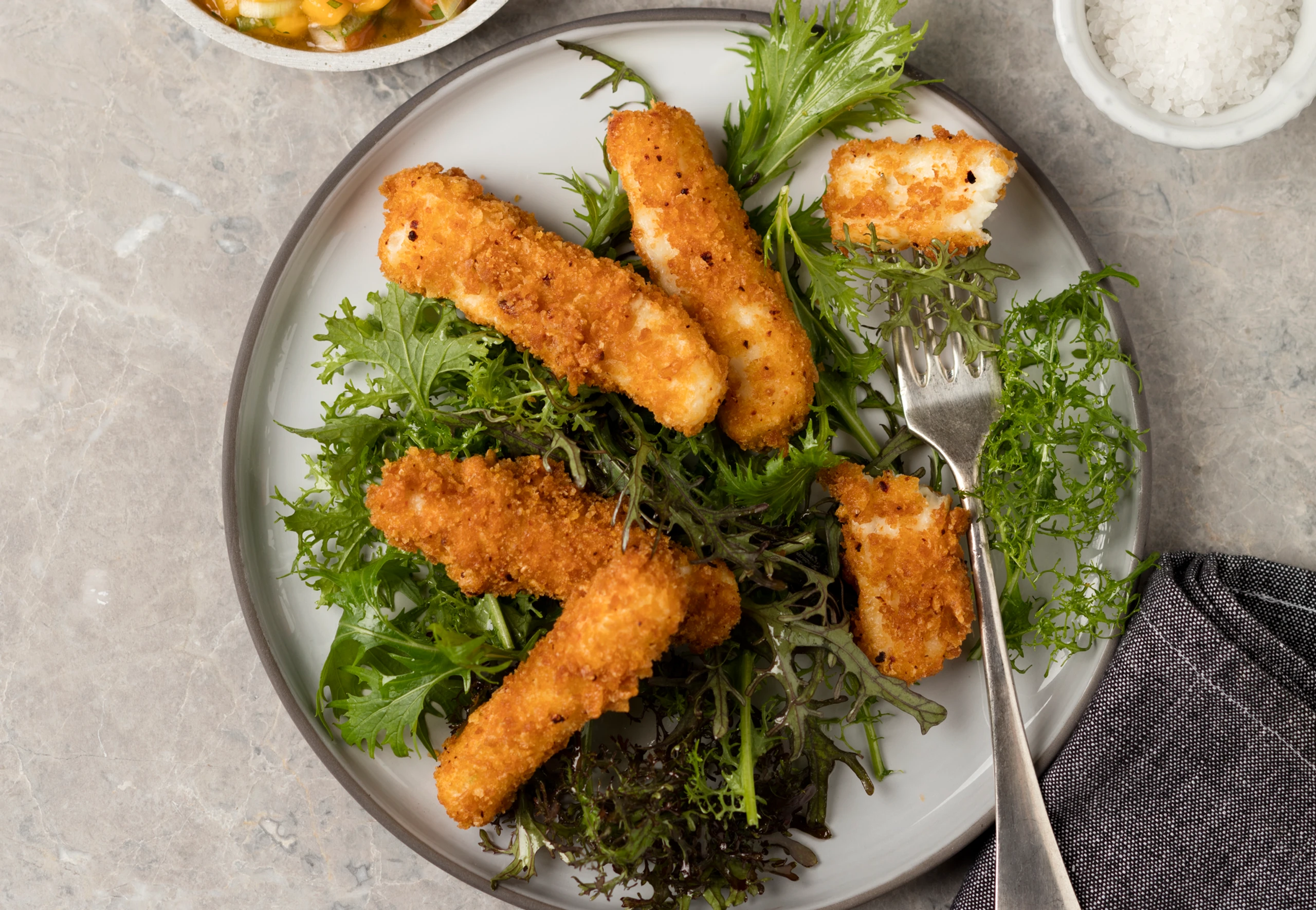 Halloumisticks mit Chili-Cornflakespanier und Asiasalat
