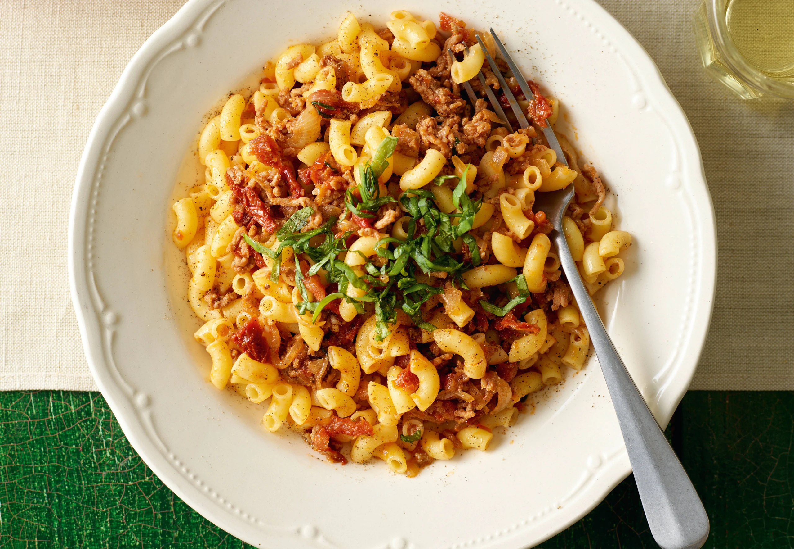 Fleisch mit Salz, Pfeffer und eventuell mehr Tomatenmark abschmecken. Nudeln untermischen.