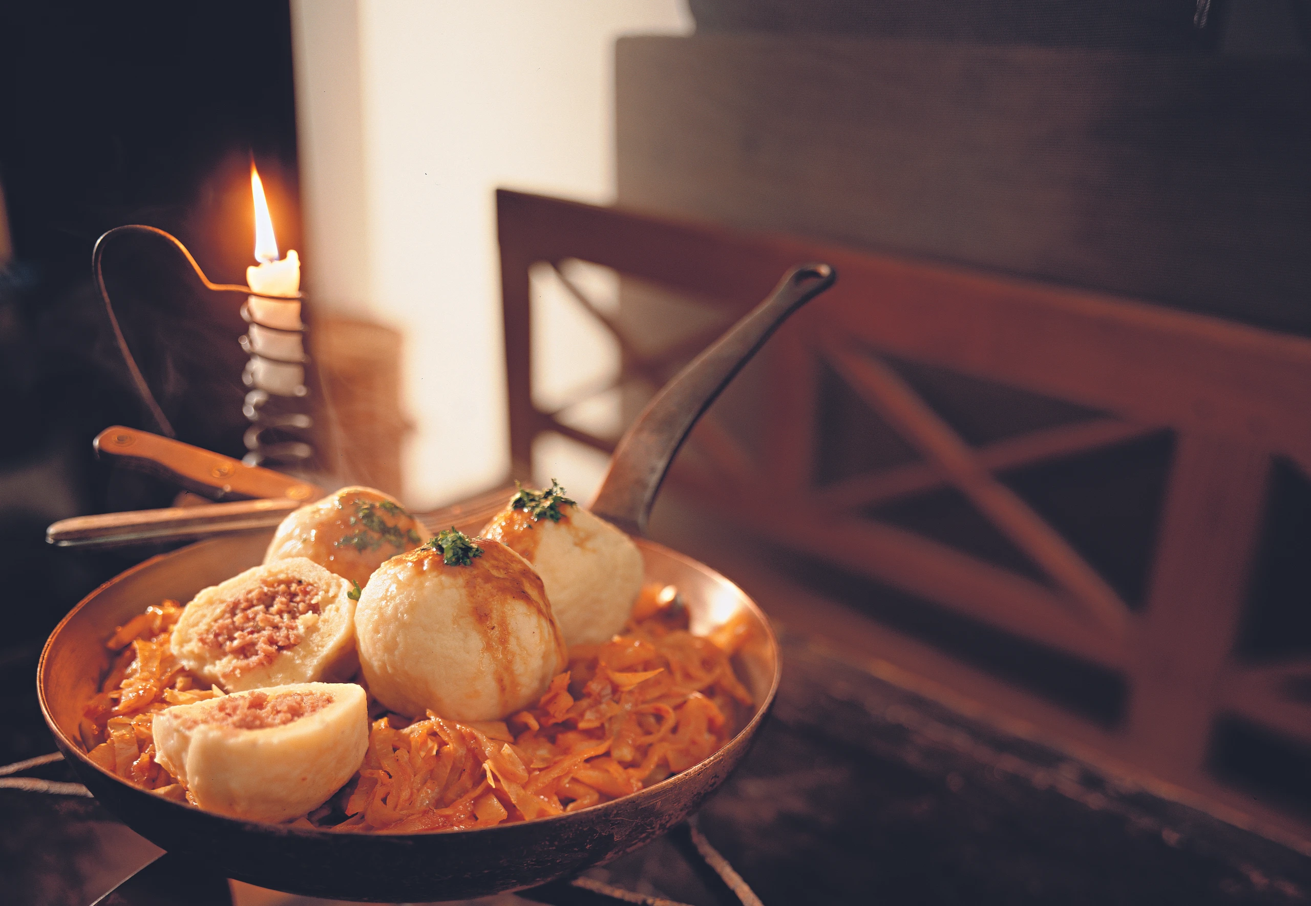 Aus der Fülle 8 Kugeln formen. Teig zu einer Rolle formen und in 8 gleich dicke Scheiben schneiden. Scheiben flach drücken, mit Fülle belegen, Teig über die Fülle ziehen, gut verschließen und zu Knödeln rollen.