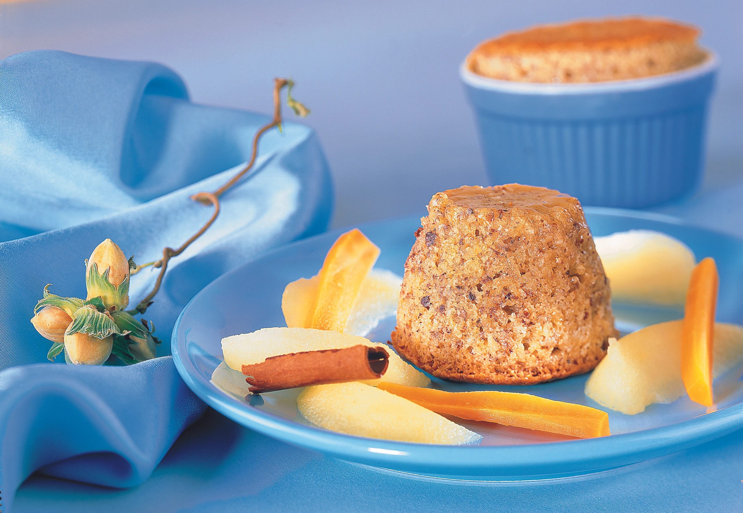 Die Haselnuss-Aufläufe aus den Förmchen stürzen und mit dem Apfel-Karotten-Kompott anrichten.