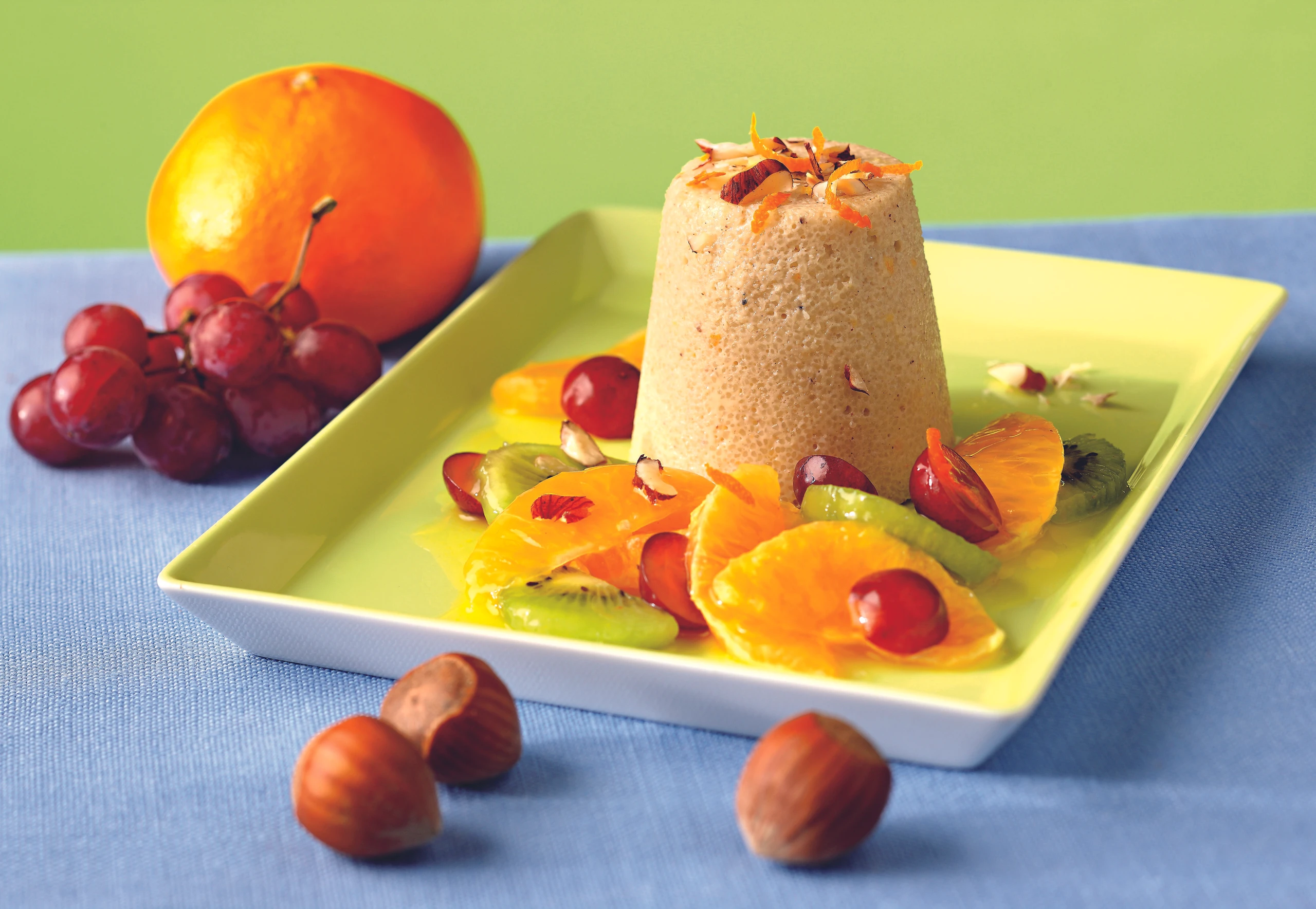 Das Flammeri in Portionsförmchen füllen und zum Festwerden für ca. 2 Stunden kalt stellen. Grießflammeri auf Dessertteller stürzen, mit dem Mandarinen-Trauben-Kiwi-Salat anrichten, mit Haselnüssen, Zitronen- und Orangen-zesten garnieren.