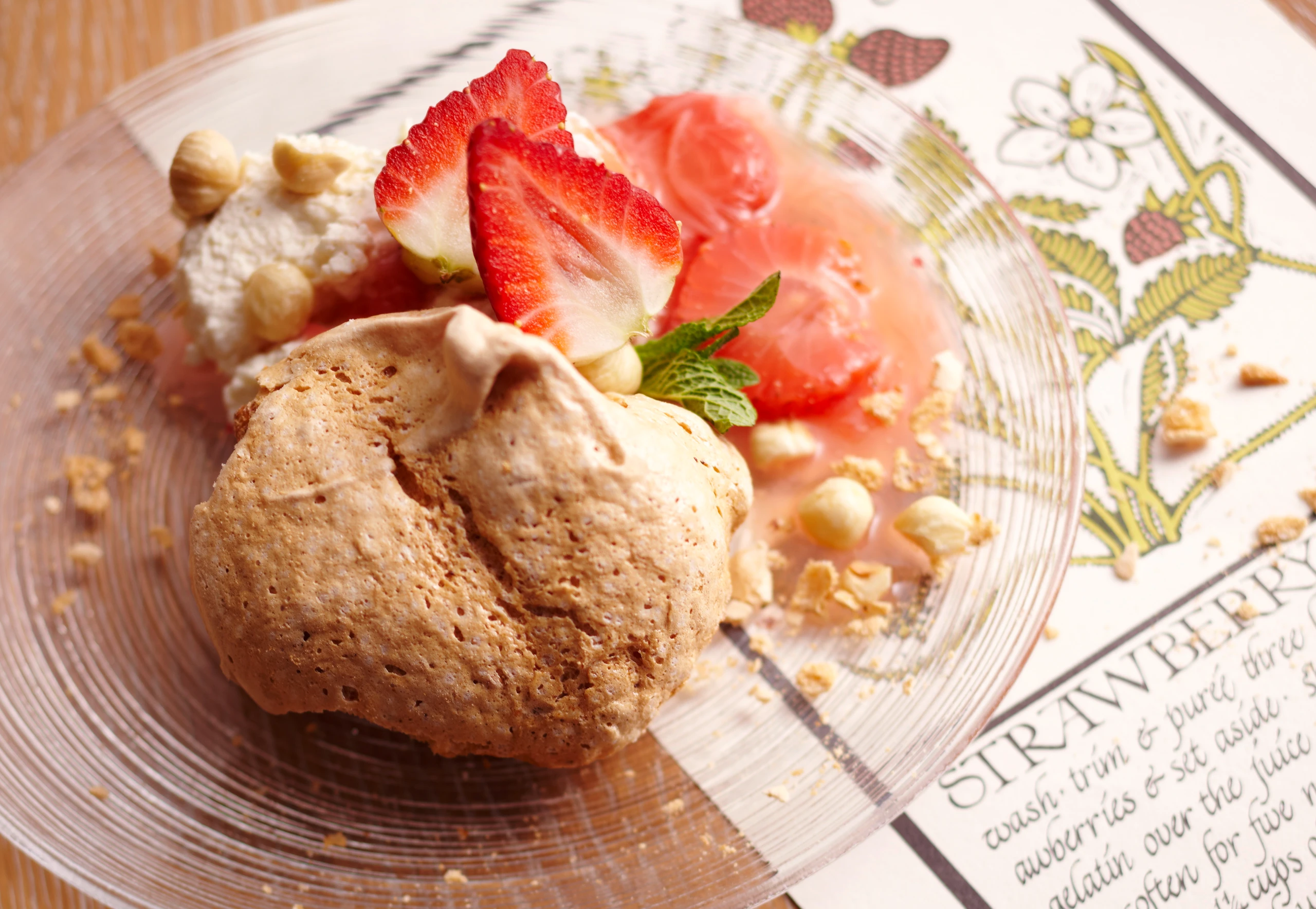 Haselnuss-Meringe, Topfencreme und Rhabarberkompott