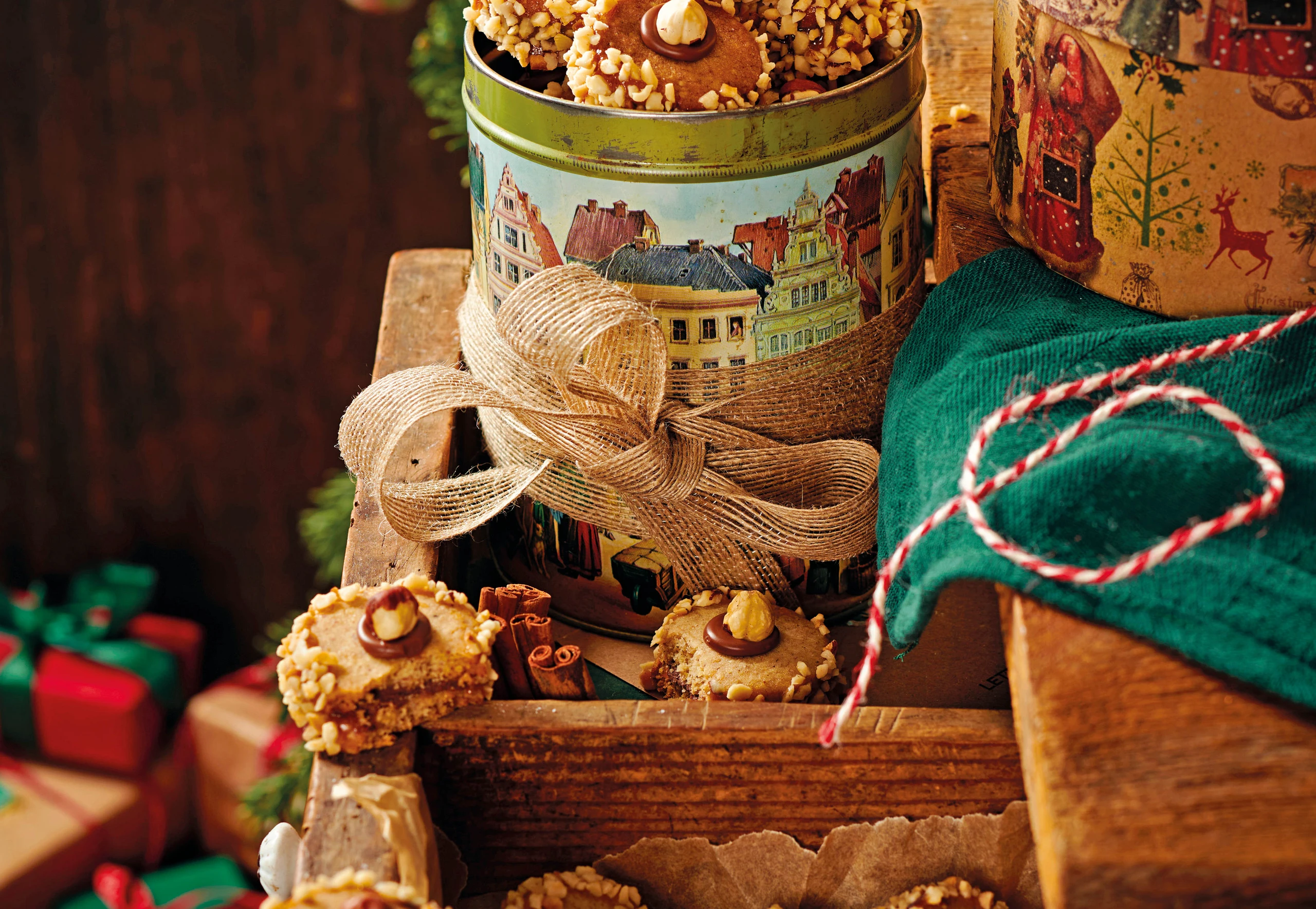 Nougat über einem Wasserbad vorsichtig schmelzen. Kleine Tupfen auf den Talern verteilen und eine Haselnuss darauf setzen.