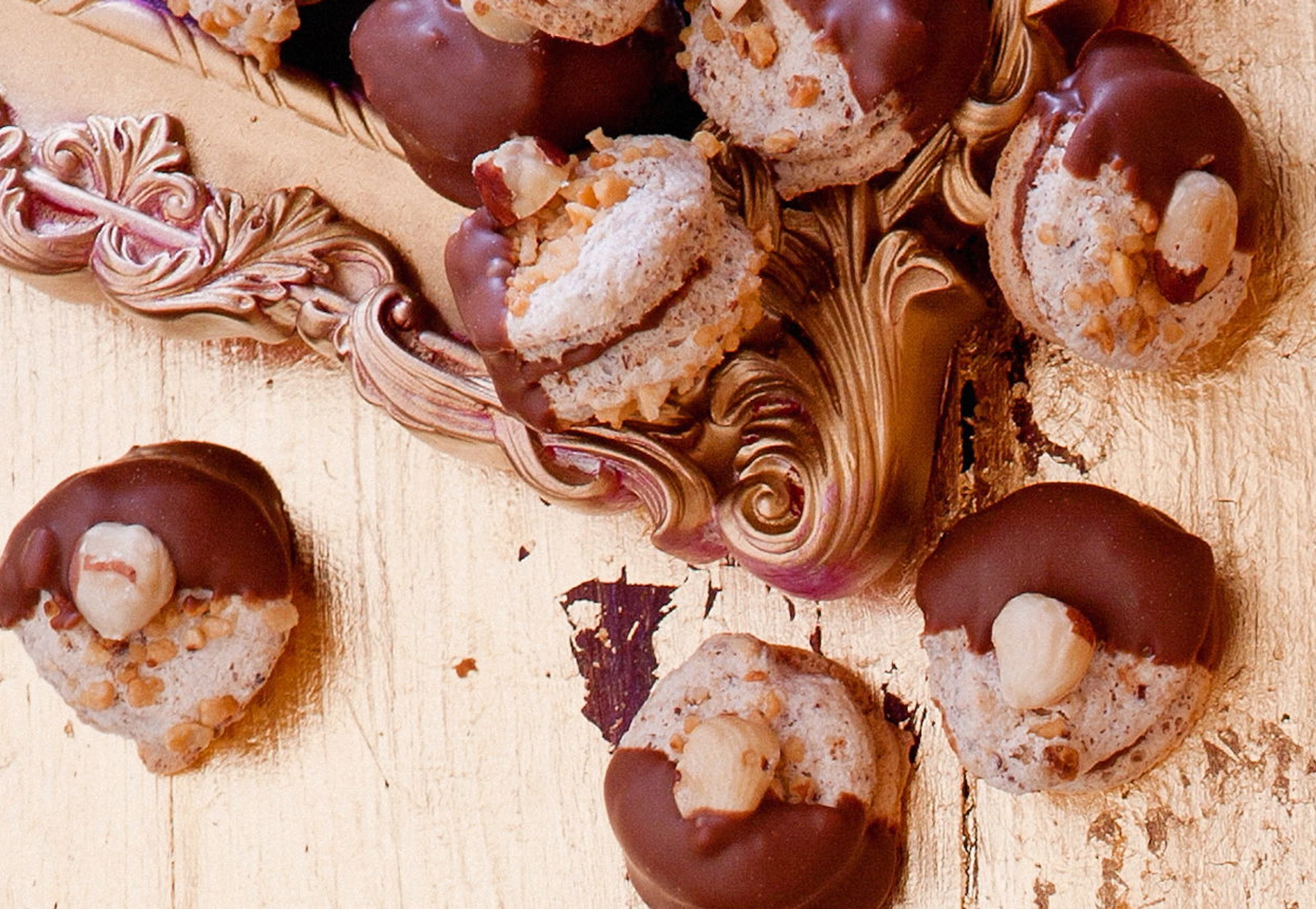 Auf die Hälfte der Scheiben die Fülle auftragen und mit den übrigen zusammensetzen. Taler zur Hälfte in die geschmolzene Kuvertüre tauchen, auf ein Backpapier legen und mit den geschälten, ganzen Nüssen garnieren. Glasur fest werden lassen.