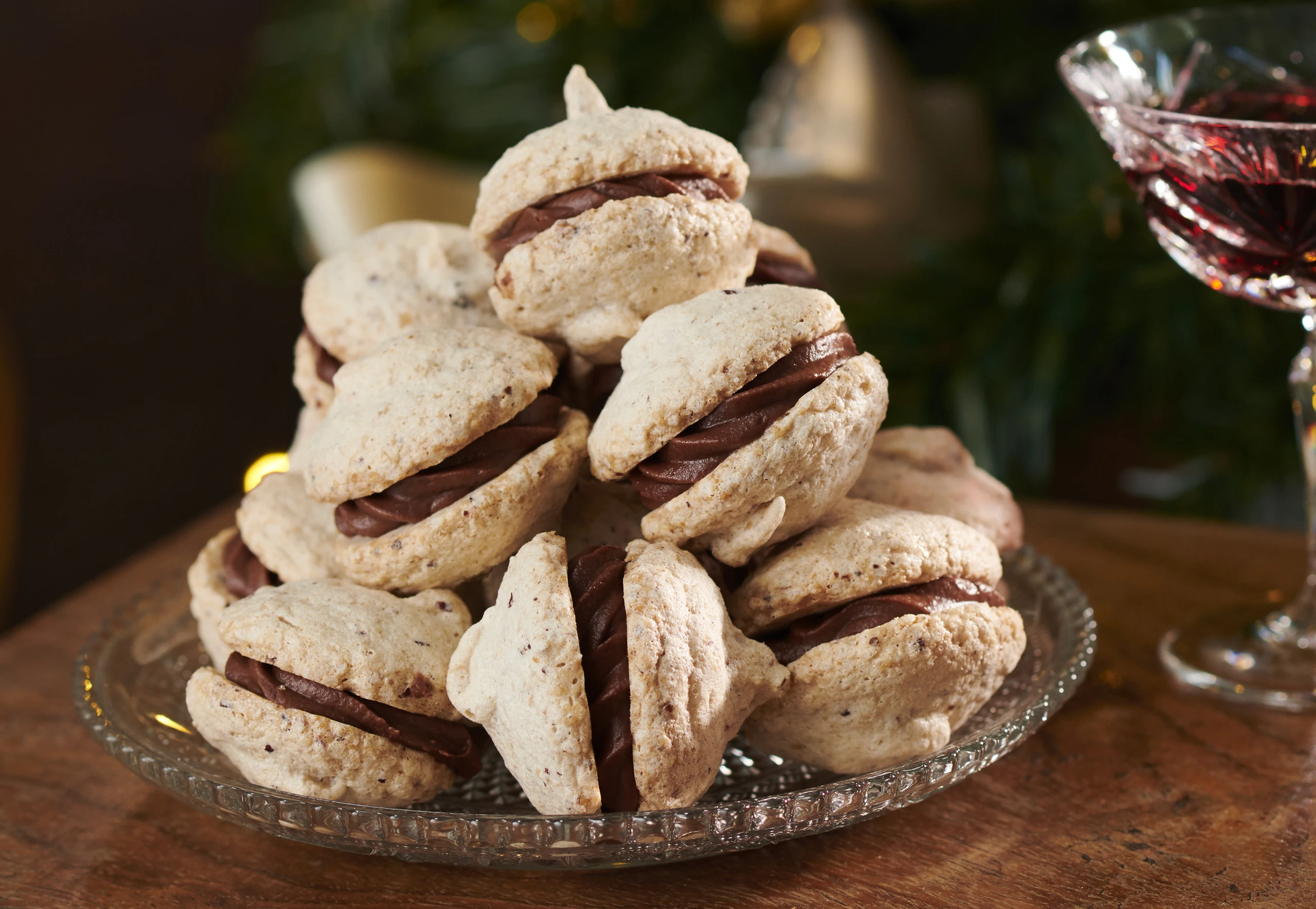 Rohr auf 150°C vorheizen. 2 Backbleche mit Backpapier belegen. Eiklar aufmixen und den Zucker teelöffelweise zugeben. Masse zu steifem Schnee schlagen und die Haselnüsse unterheben. Masse in einen Dressiersack mit Lochtülle (Ø ca. 1 cm) füllen und Tupfen auf die Bleche dressieren.