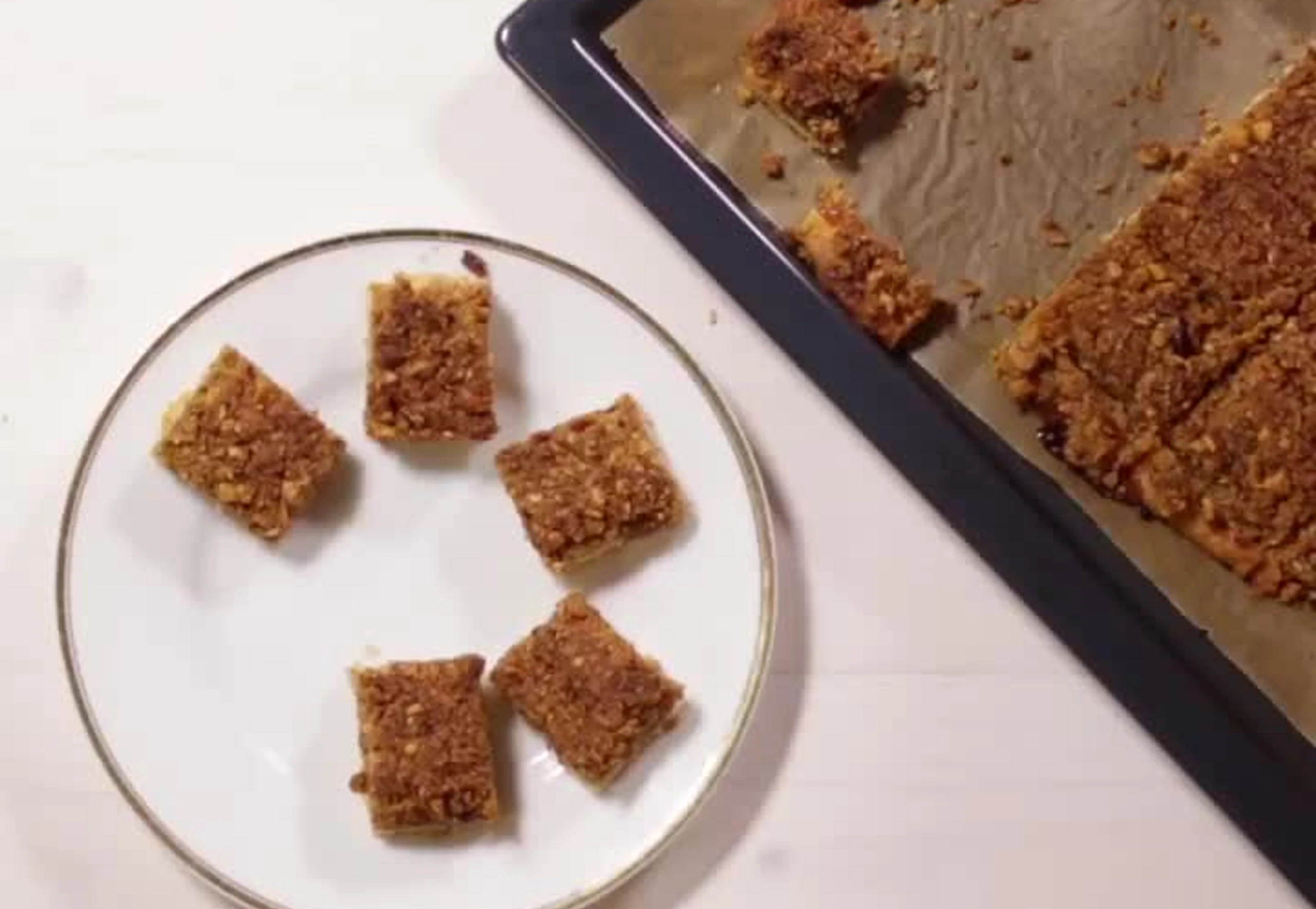 Für den Belag Butter, Zucker und Vanillezucker erhitzen, bis der Zucker sich aufgelöst hat. Die geriebenen und gehackten Nüsse untermischen. Nussmasse auf dem Teig verstreichen. Schnitte im Rohr (mittlere Schiene) ca. 30 Minuten backen, bis der Rand goldbraun ist. Herausnehmen und abkühlen lassen. Schnitte in kleine Ecken schneiden.