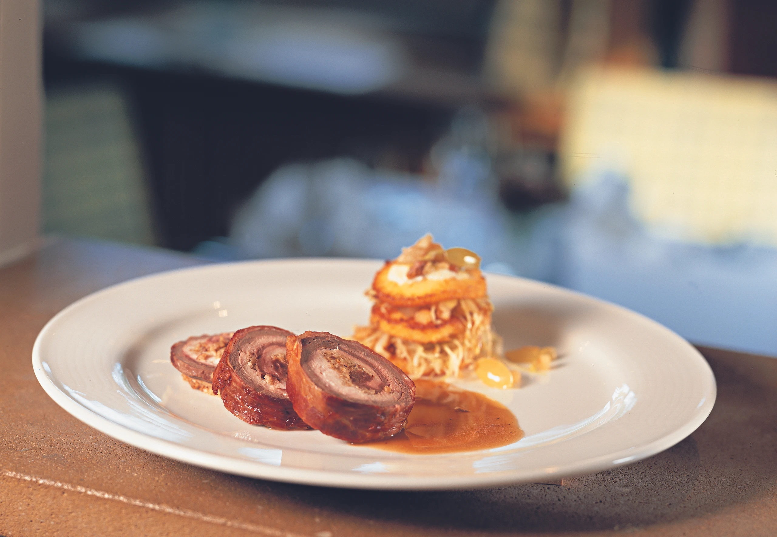 Hasen-Kaninchen-Roulade mit Polenta-Kraut-Türmchen