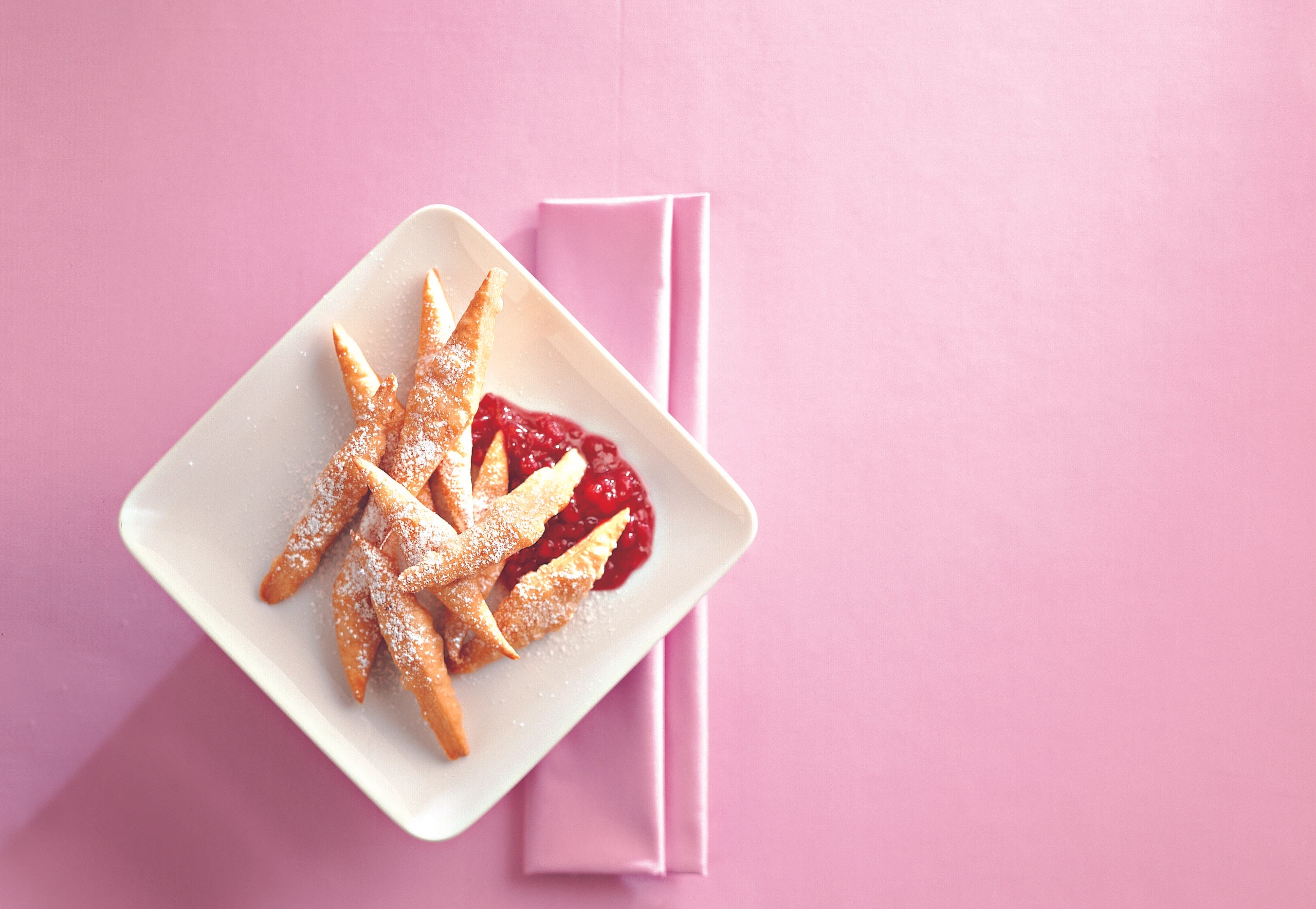 Obers schlagen. Hasenöhrln mit Staubzucker bestreuen, mit Preiselbeerkompott und Schlagobers servieren.