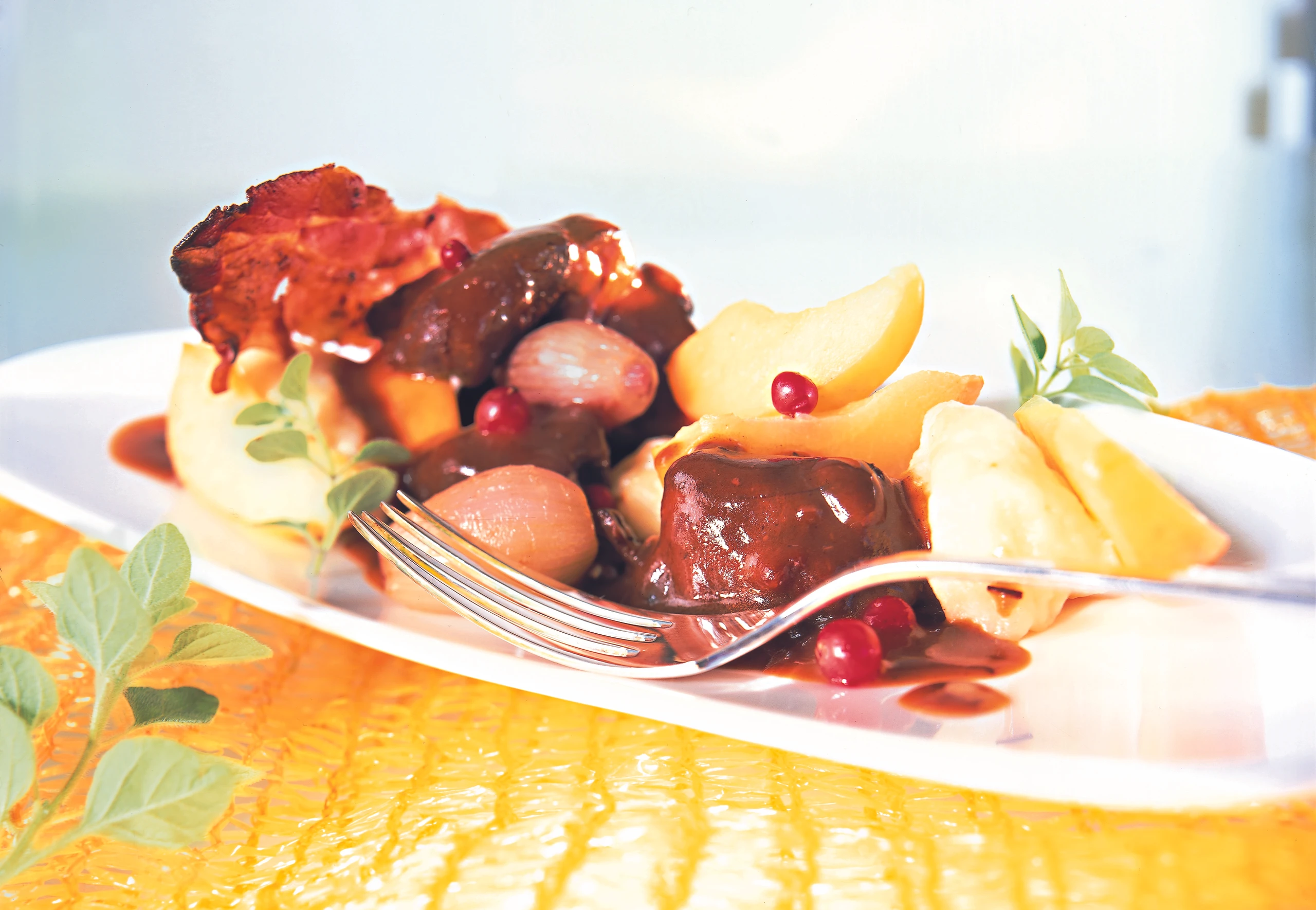 Fleisch aus dem Topf heben, Sauce durch ein Sieb passieren. Rahm mit Mehl glatt rühren, in die Sauce gießen und 1 Minute köcheln. Sauce mit Salz und Pfeffer abschmecken. Hasenpfeffer mit Nockerln, Schalotten, gebratenem Speck und Preiselbeeren anrichten.