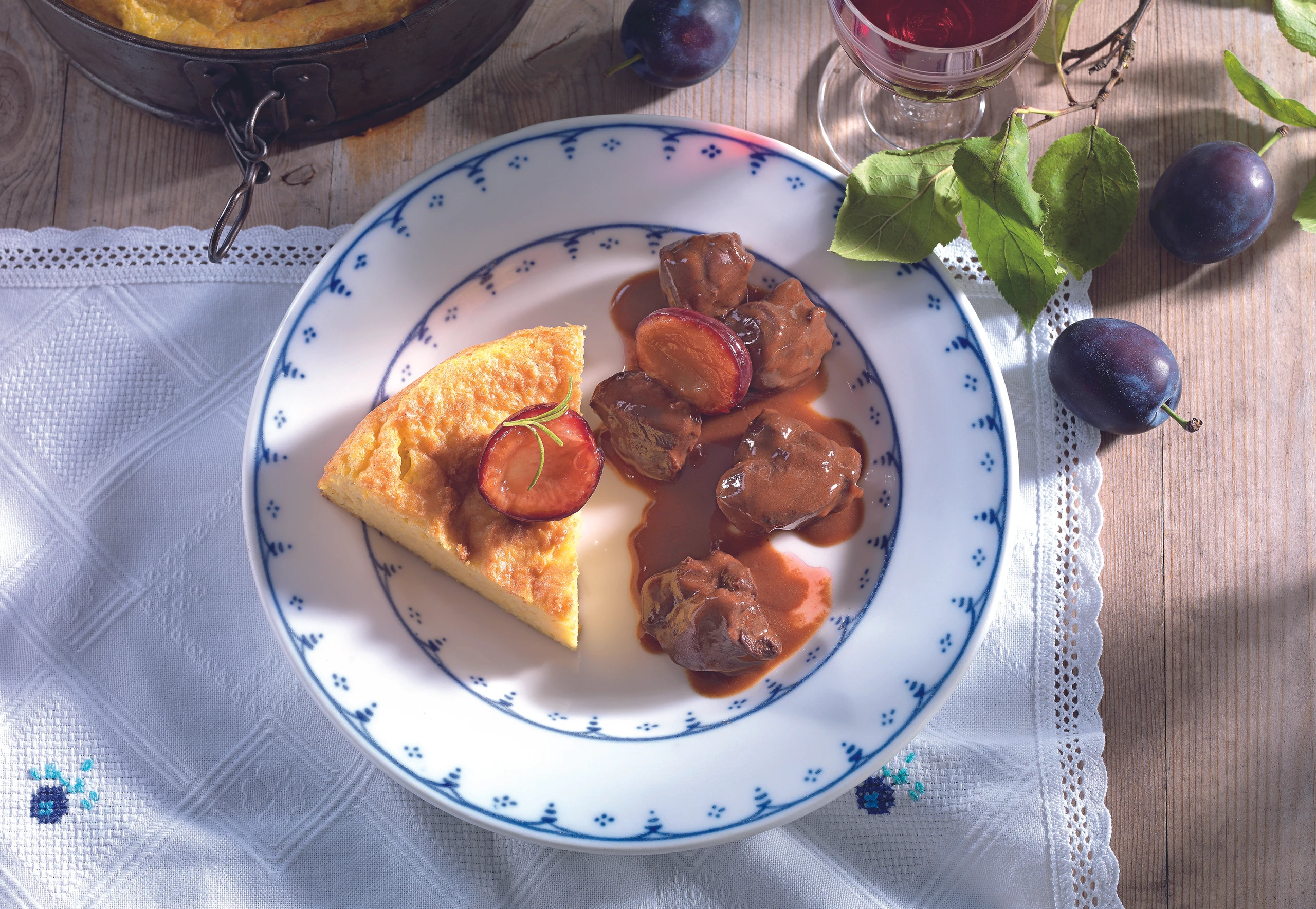 - Zwetschken halbieren, entkernen, in Zucker und Weißwein 10 Minuten schmoren.