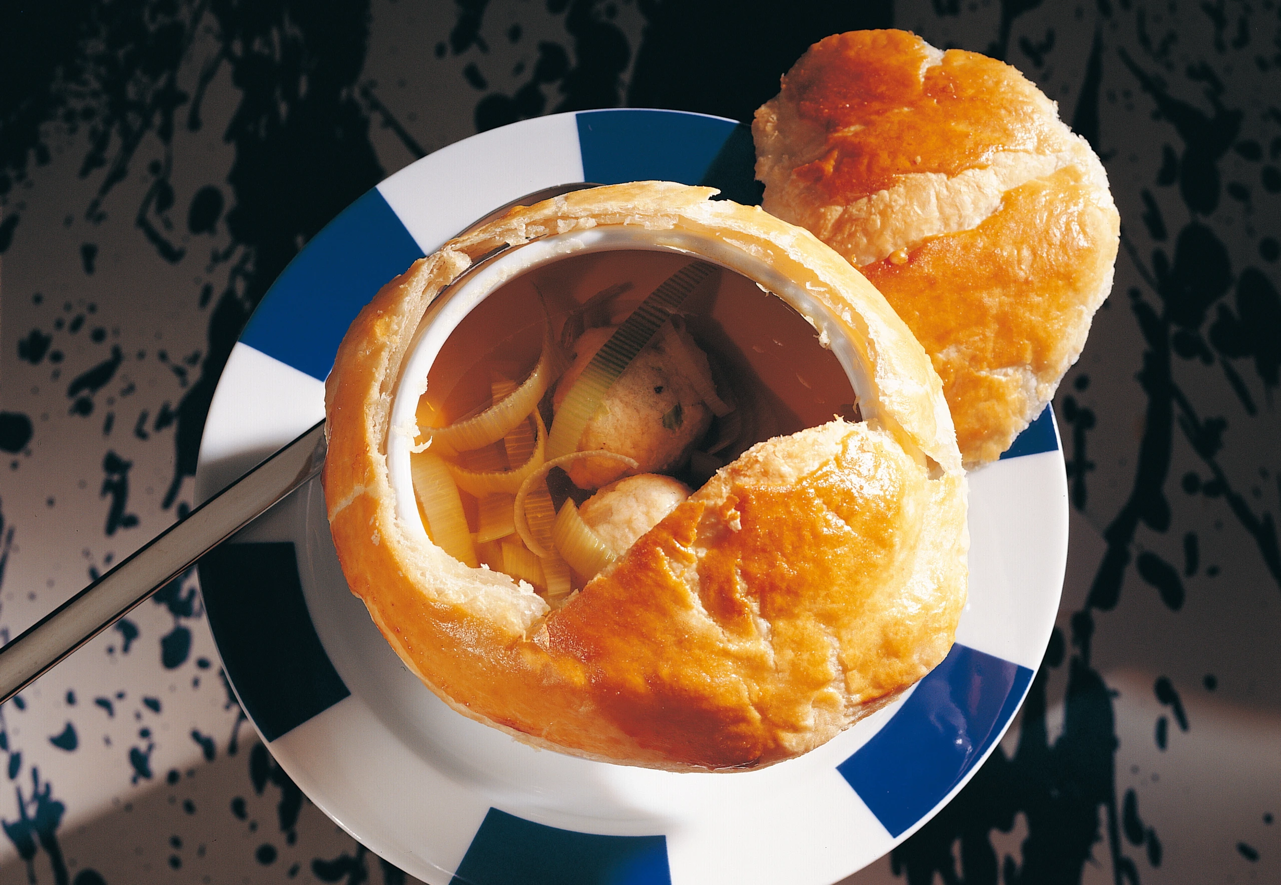 Tassen auf den Gitterrost stellen. Suppen im vorgeheizten Rohr (unterste Schiene) so lange backen, bis der Teig goldgelb ist (dauert ca. 1/4 Stunde). Suppentassen auf Untertassen stellen und servieren.