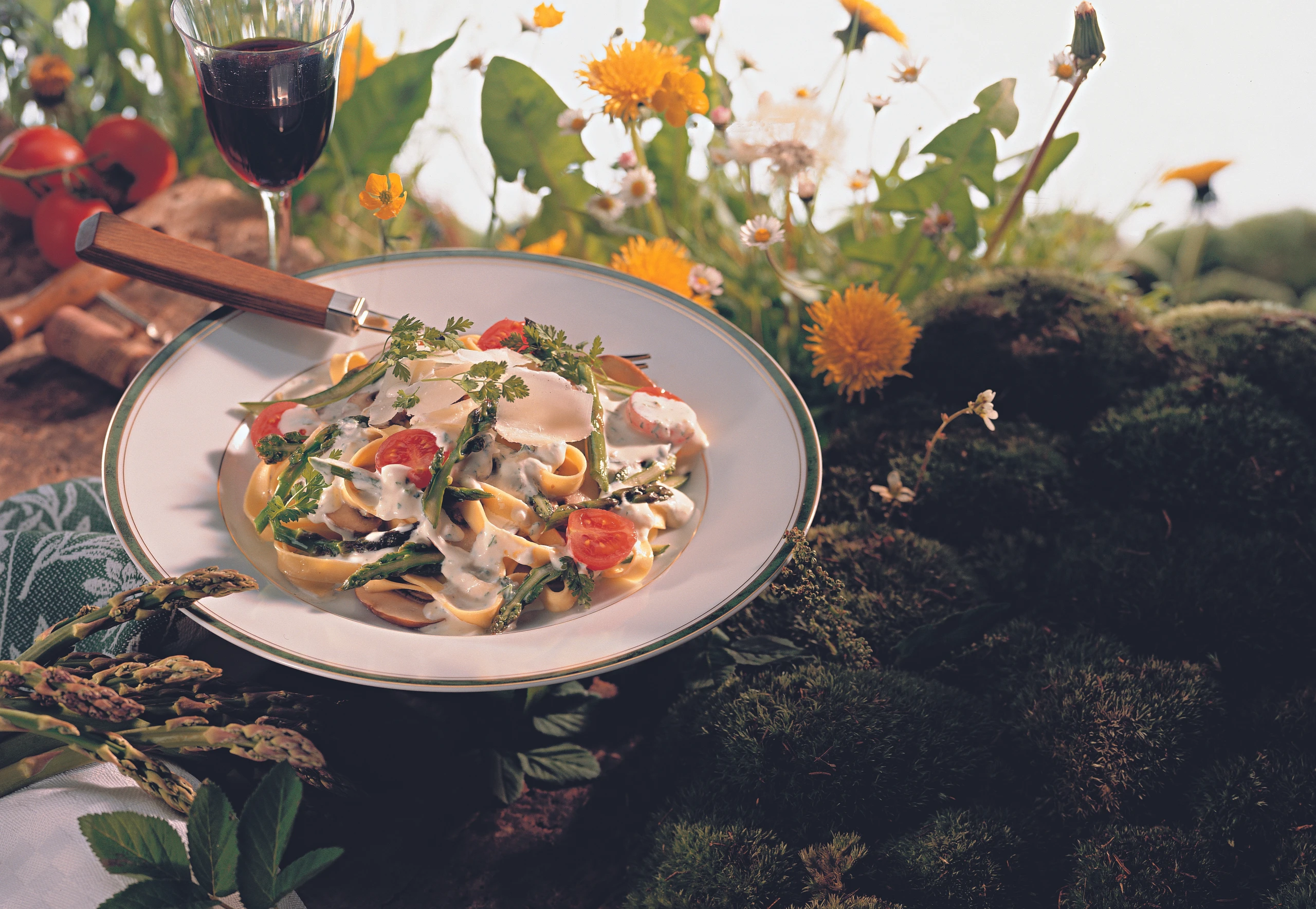 Hausgemachte Nudeln mit Kerbel und grünem Spargel