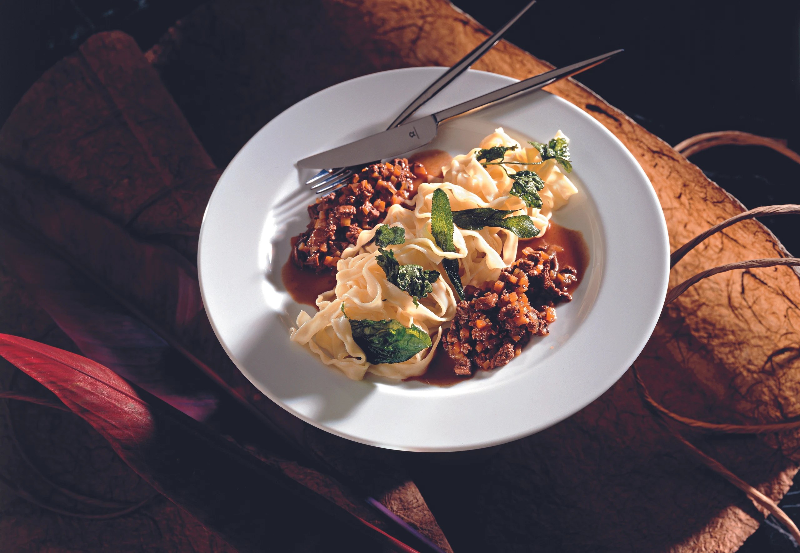 Paradeismark kurz mitrösten. Fleisch mit Rotwein und Gin ablöschen und mit Suppe aufgießen. Wacholderbeeren leicht quetschen, in ein Teefiltersäckchen füllen und zugeben. Das Ragout auf kleiner Flamme ca. 1/2 Stunde köcheln. Wacholderbeeren entfernen.