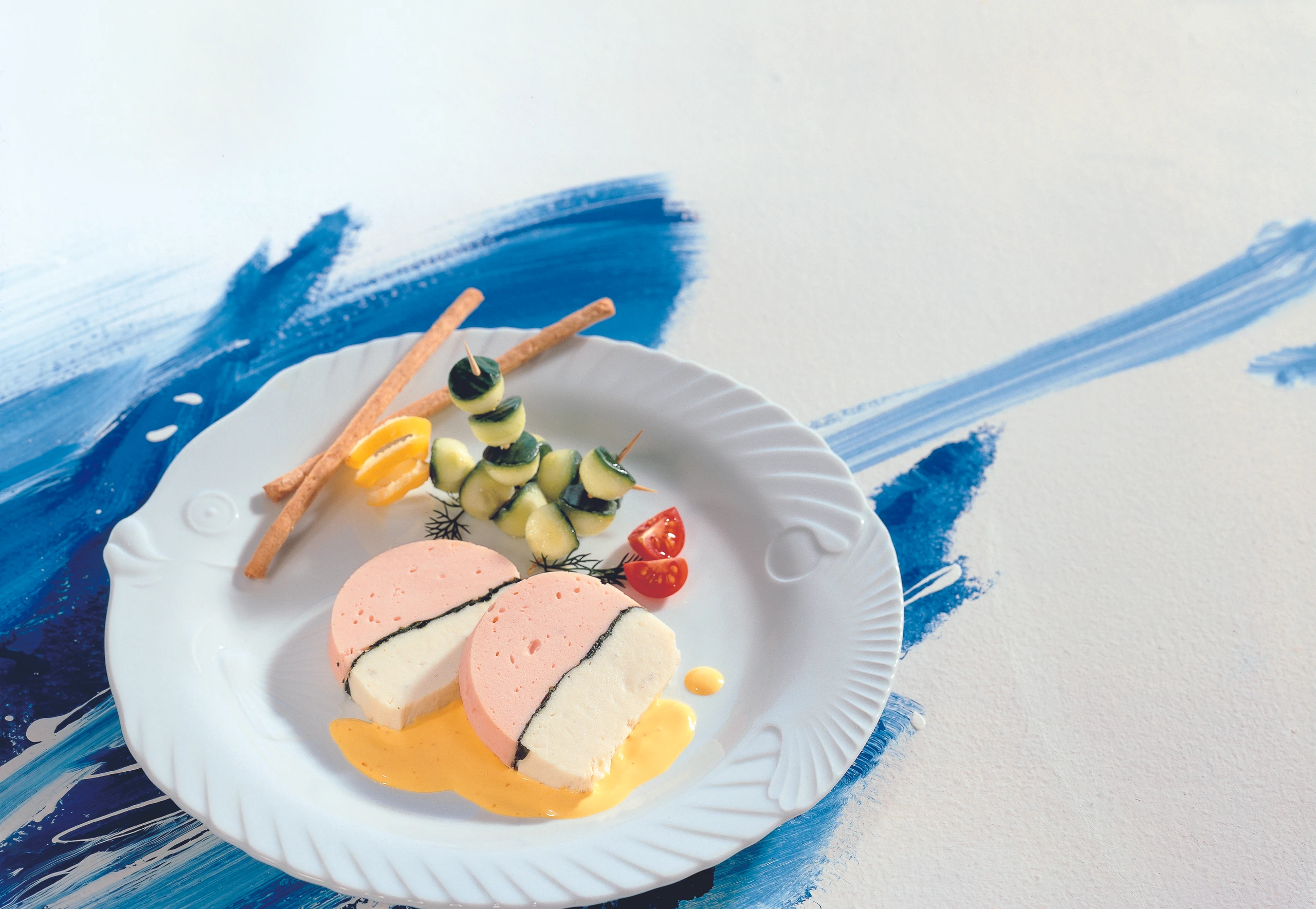 Zum Anrichten die Terrine aus der Form stürzen, Folie abziehen und die Terrine in Scheiben schneiden. Mit Safransauce und Gurkenspießen anrichten.