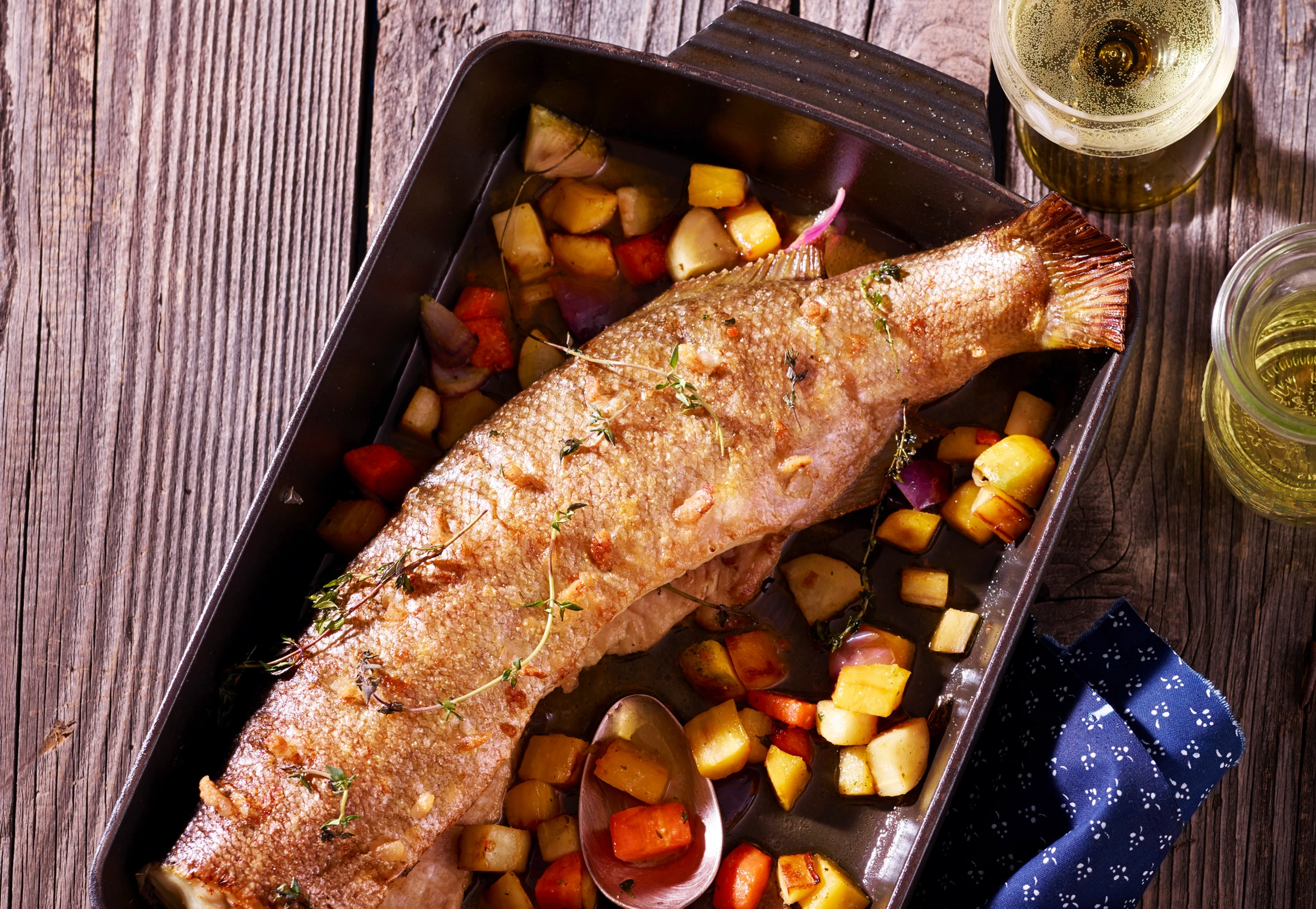 Butterschmalz in einer eckigen Pfanne erhitzen, Fisch darin beidseitig anbraten und im Rohr (untere Schiene / Gitterrost) ca. 45 Minuten goldbraun braten; nach halber Garzeit Gemüse zugeben. Wein nach und nach zugießen.