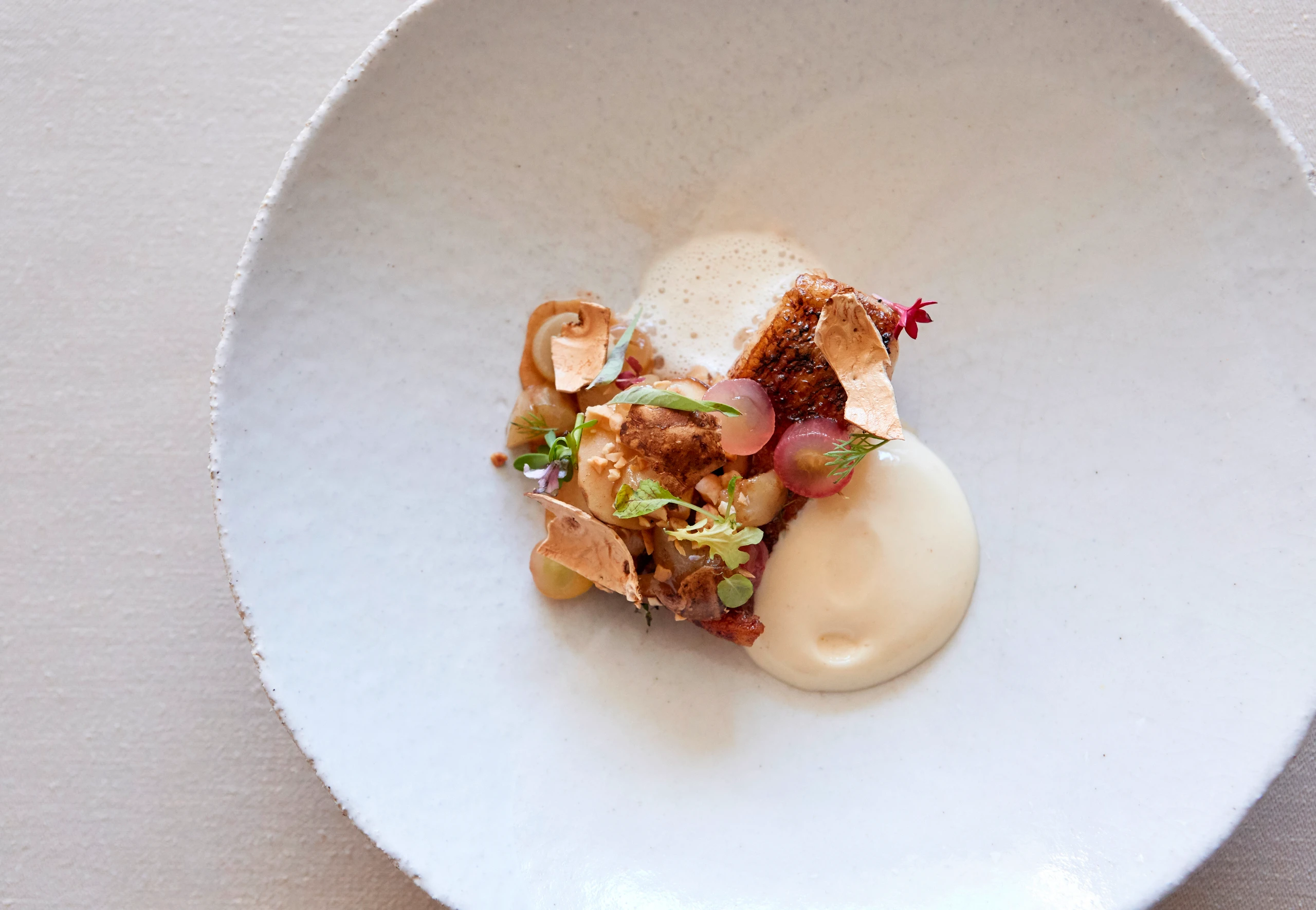 Filets mit Pilzen, Topinambur, Trauben, Nüssen, Chips, Kräutern, Sabayon und Beurre blanc anrichten.