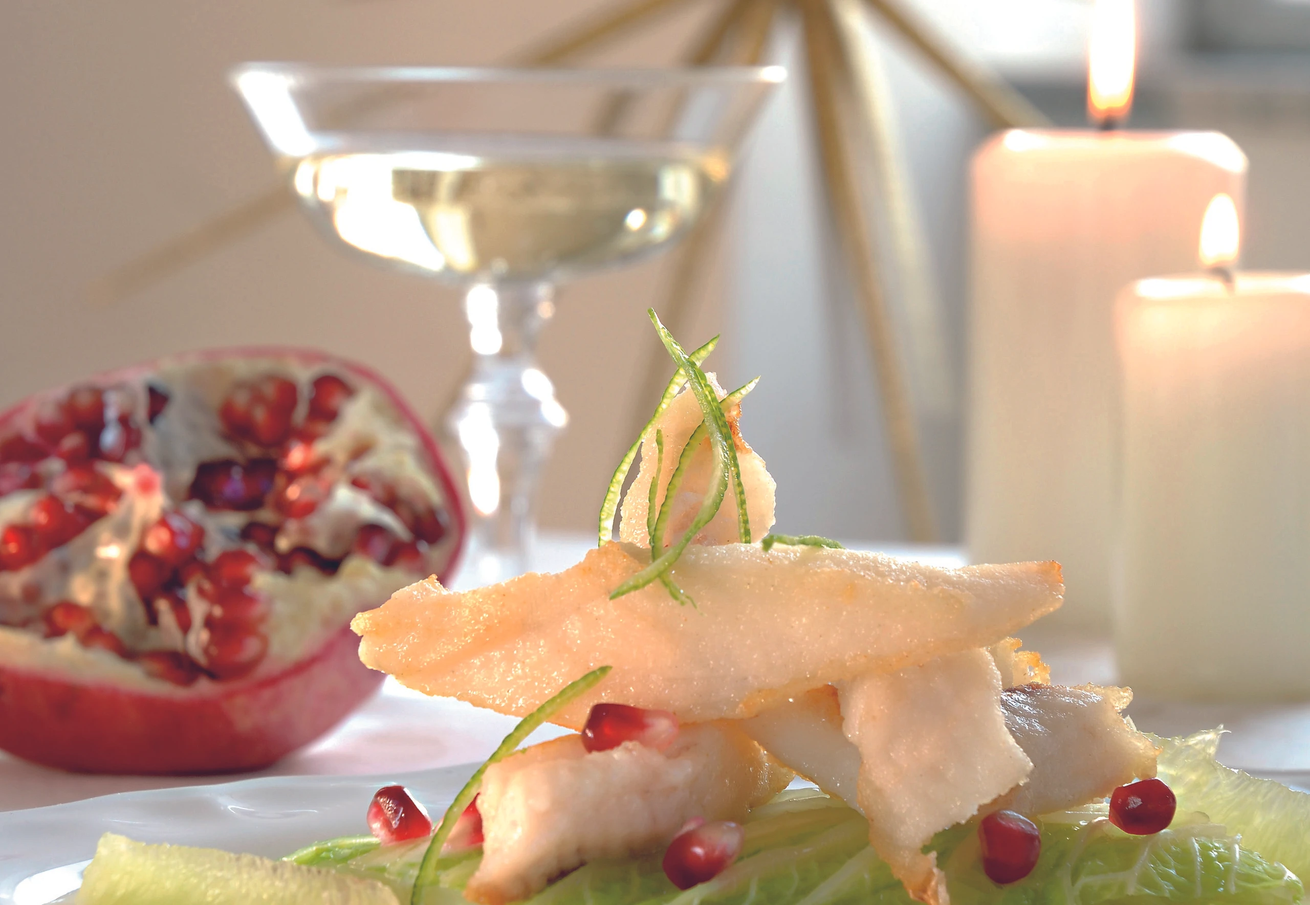 Chinakohl für 5 Minuten ins Rohr schieben. Limettenfilets in die heiße Sauce geben und kurz ziehen lassen. Öl erhitzen, Hechtstreifen salzen und 2 Minuten goldgelb braten. Eventuell verbliebene, herausstehende Gräten herausziehen. Hechtstreifen auf den Chinakohl legen, mit Sauce anrichten. Mit Granatapfelkernen bestreuen.