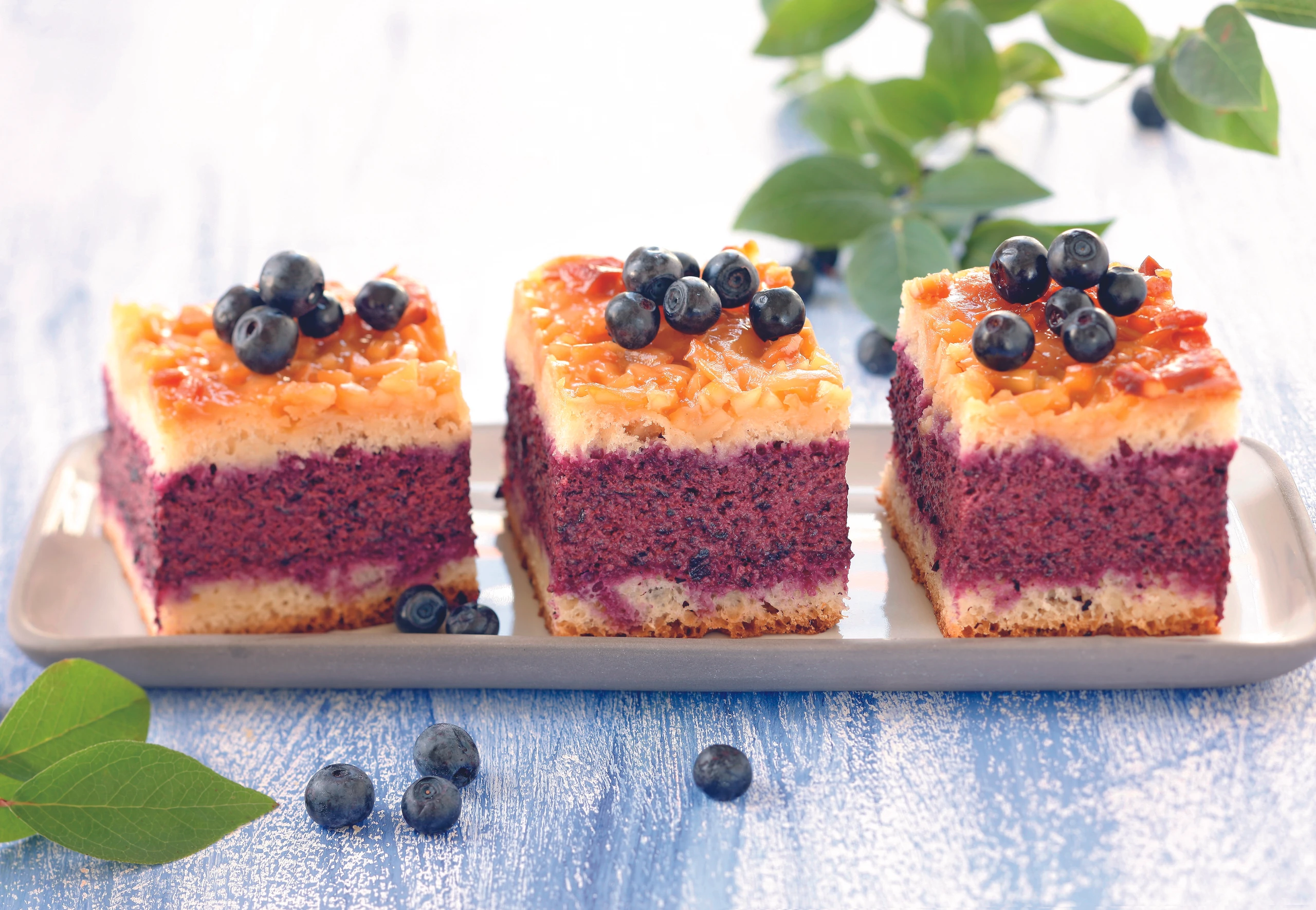 Kuchen in der Mitte horizontal durchschneiden. Für die Fülle Heidelbeeren mit Staubzucker pürieren. Gelatine in kaltem Wasser einweichen. Orangen- und Zitronensaft erwärmen, Gelatine ausdrücken, darin auflösen und mit dem Heidelbeerpüree verrühren. Obers schlagen und unterheben. Kuchenunterteil auf ein Brett legen, mit einer Rahmenform umstellen und die Creme darin verstreichen. Kuchen für ca. 30 Minuten kühl stellen. Oberteil daraufsetzen, behutsam andrücken und für ca. 4 Stunden kühl stellen. Kuchen vom Formrand lösen, Form abheben. Bienenstich portionieren und mit Heidelbeeren garniert servieren.