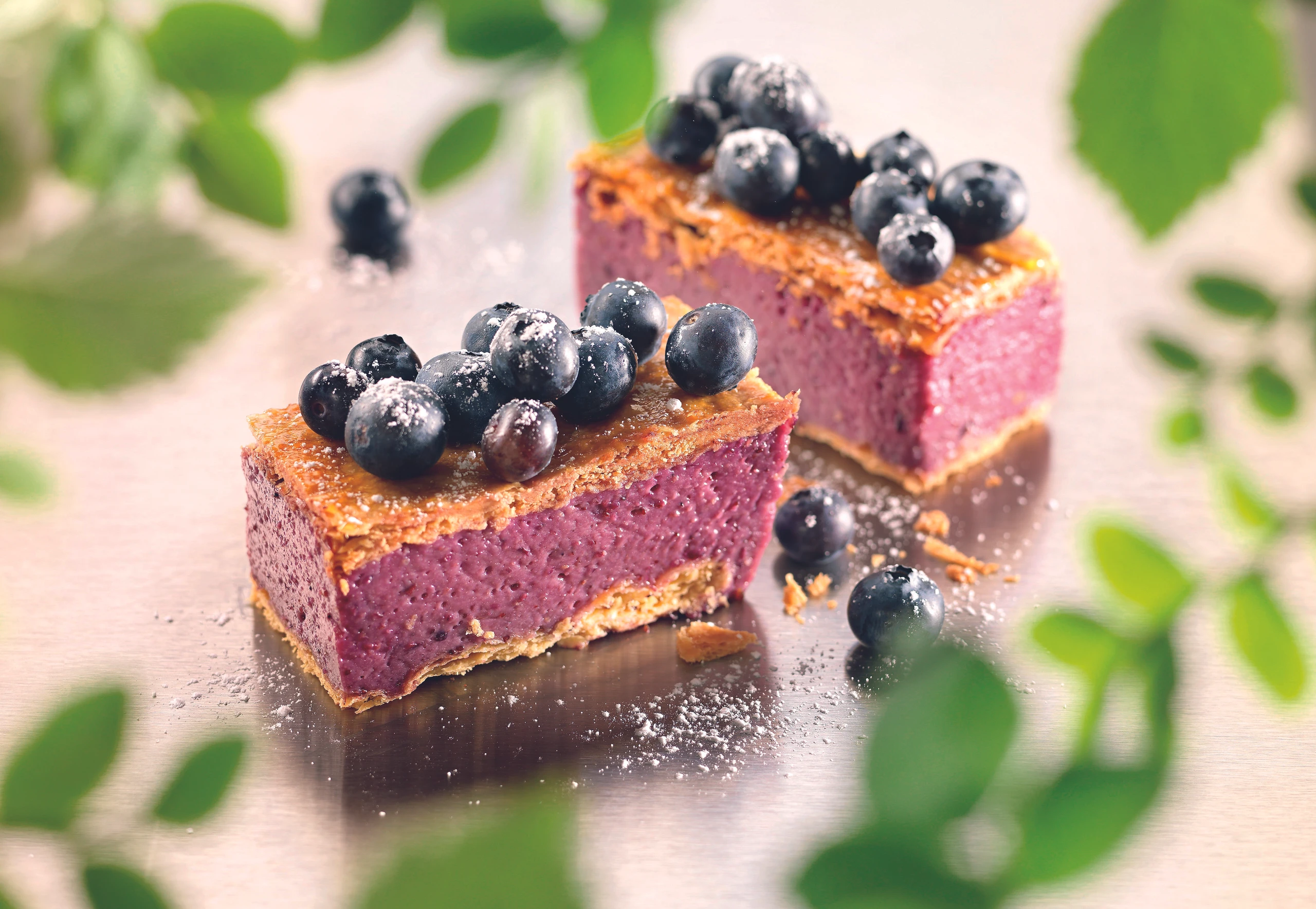 Schnitte rundum von der Form schneiden. Form abheben. Schnitte portionieren, dünn mit Marmelade bestreichen, mit Heidelbeeren garnieren und mit Staubzucker bestreut servieren.