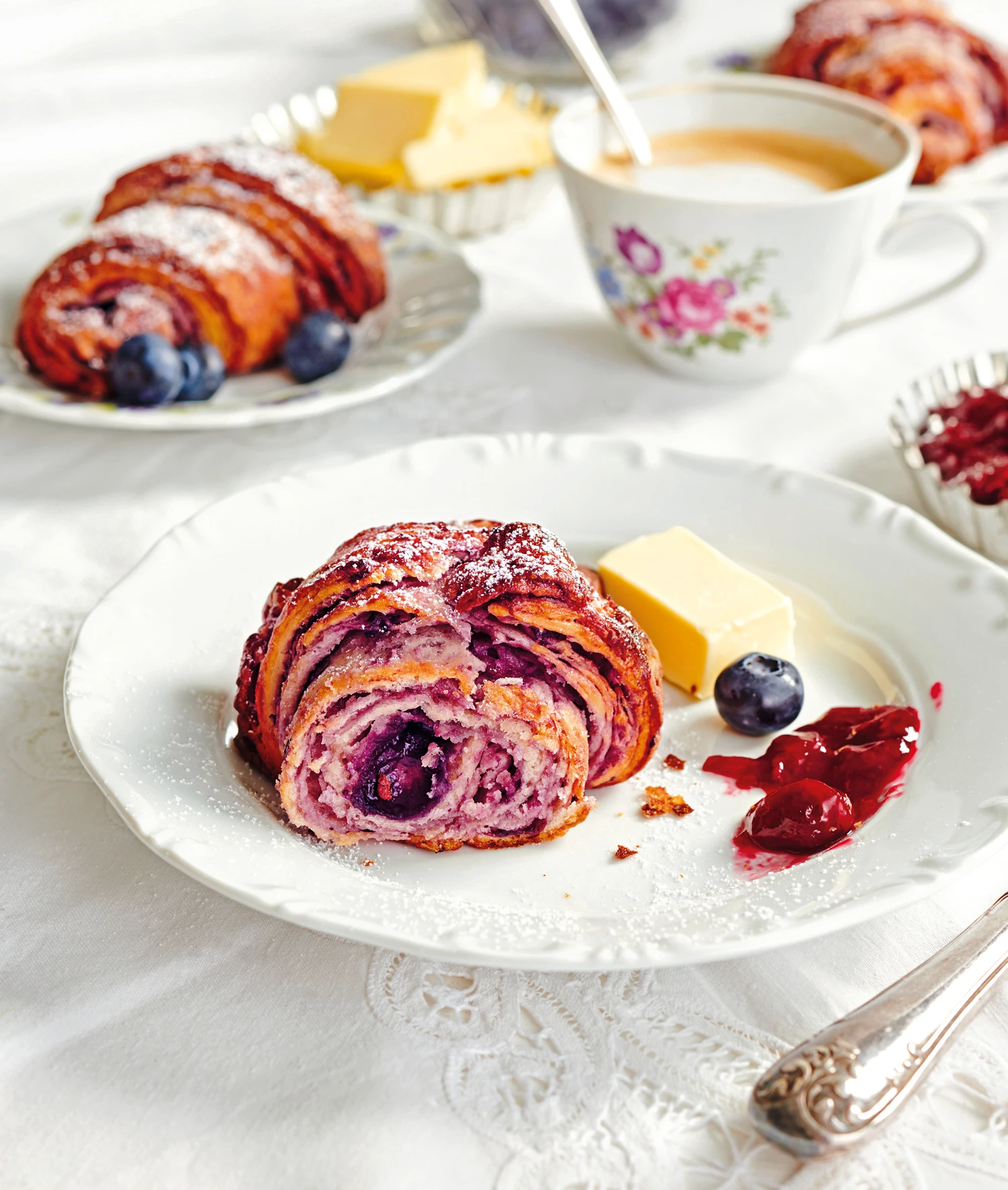 Breite Seite mit je 5 Heidelbeeren belegen und zum spitzen Ende hin einrollen. Mit übrigem Teig und Heidelbeeren wiederholen. Croissants auf das Blech legen, mit Ei bestreichen und im Rohr ca. 35 Minuten backen.