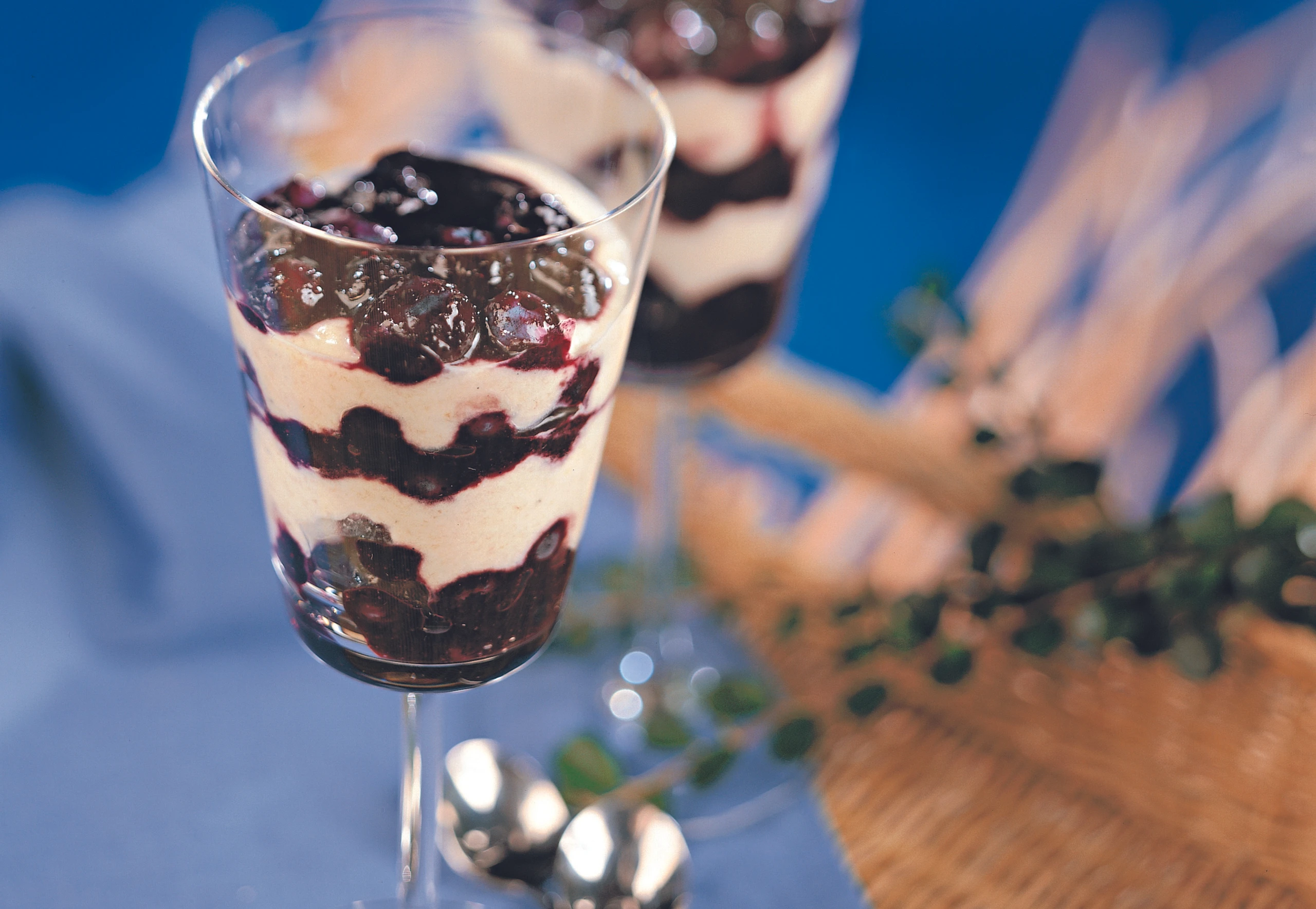 Für die Creme Vanilleschote längs durchschneiden, Mark mit dem Messerrücken herauskratzen. Bananen schälen und in kleine Stücke schneiden. Milch mit Vanillemark, Zucker und Bananenstücken verrühren und aufkochen. Mischung zudecken und ziehen lassen, bis die Bananenstücke zerfallen. Masse auskühlen lassen. Obers schlagen und unterheben. Bananencreme und Heidelbeerkompott schichtweise in Gläser oder Schalen füllen.