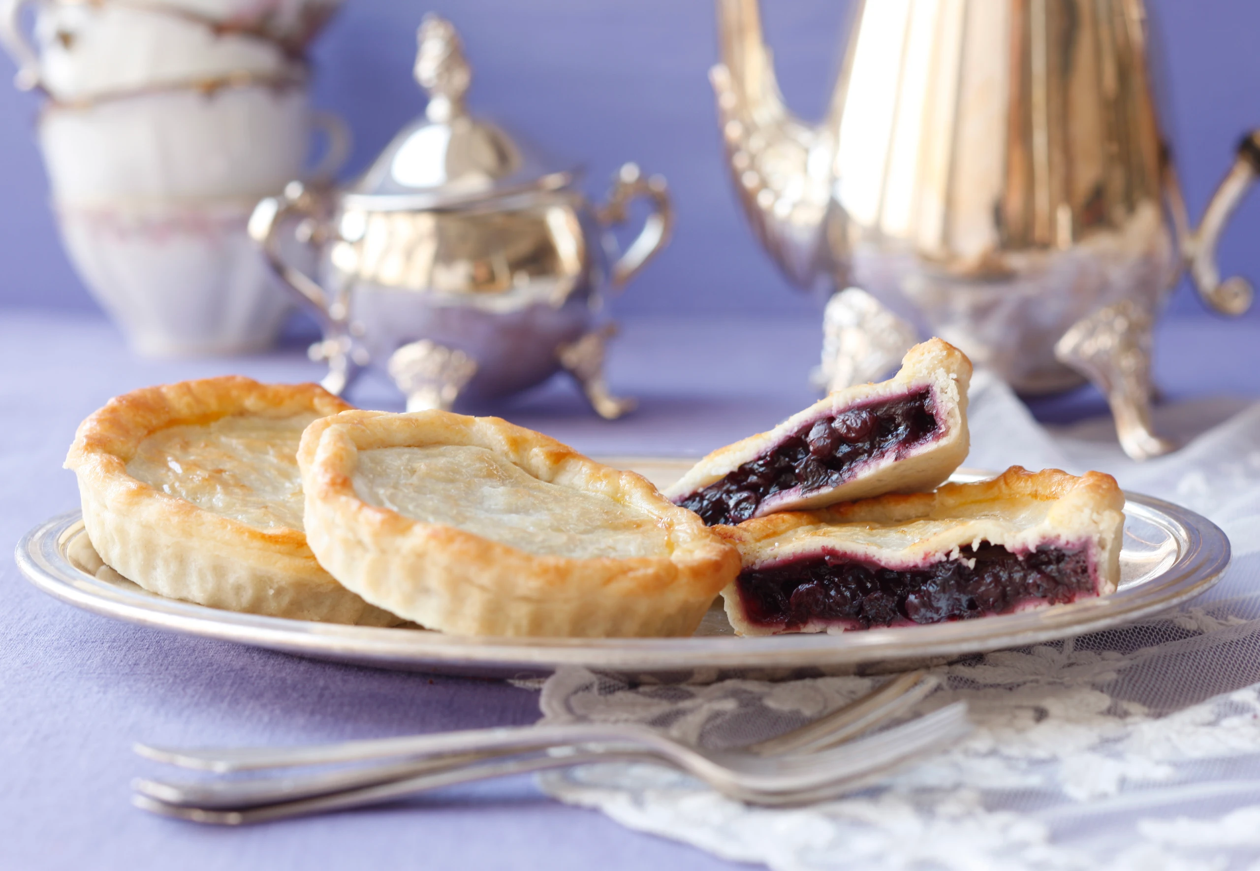 Formen mit je 1 Teigscheibe auslegen, Beeren darauf verteilen, mit je 1 Teigscheibe abdecken. Ränder festdrücken. Teig mit einer Gabel mehrmals einstechen, mit Ei bestreichen und im Rohr (mittlere Schiene / Gitterrost) ca. 20 Minuten backen.