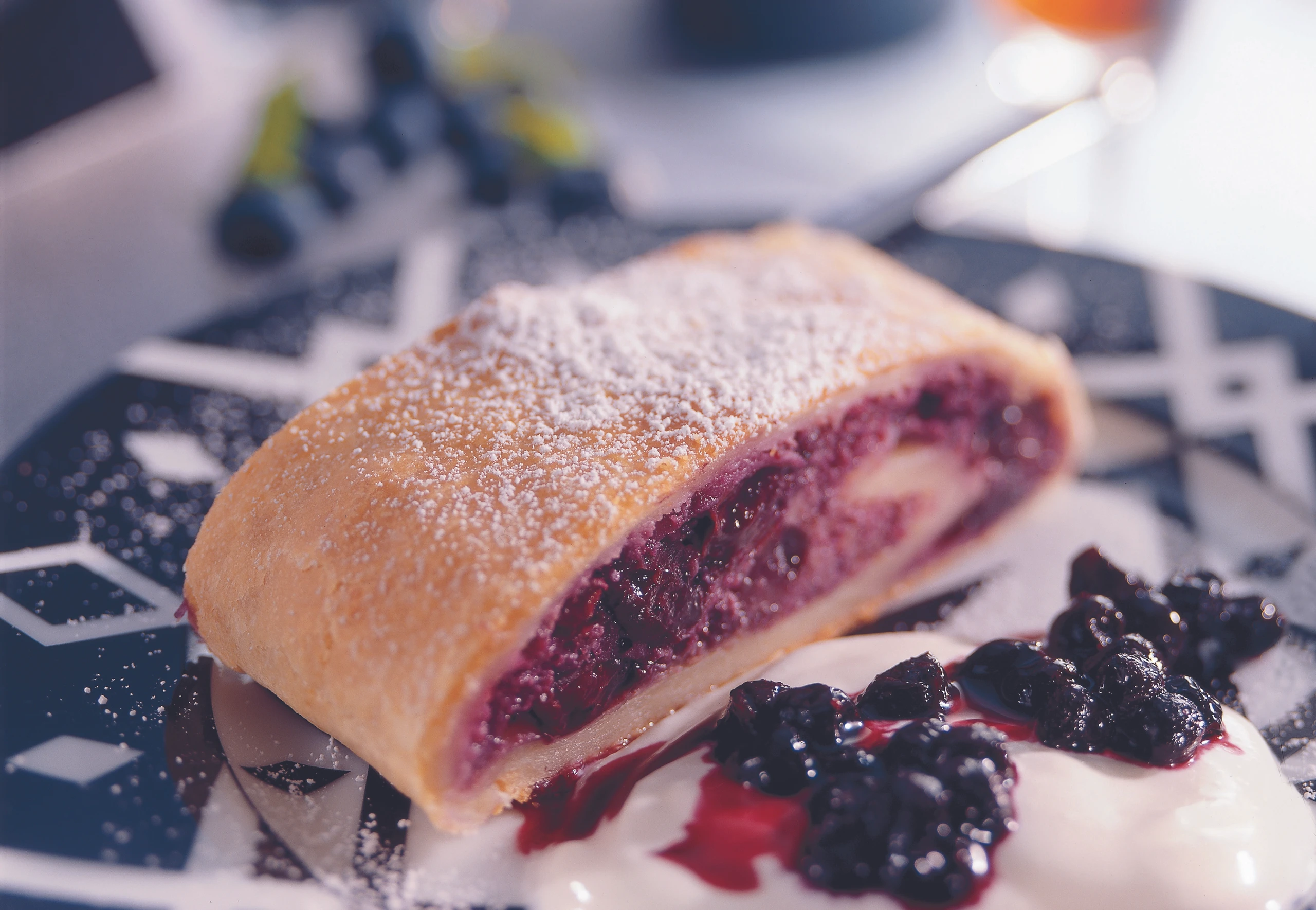 Strudel aus dem Rohr nehmen und abkühlen lassen. Mit Staubzucker bestreuen, mit Rahm- und Heidelbeersauce anrichten.
