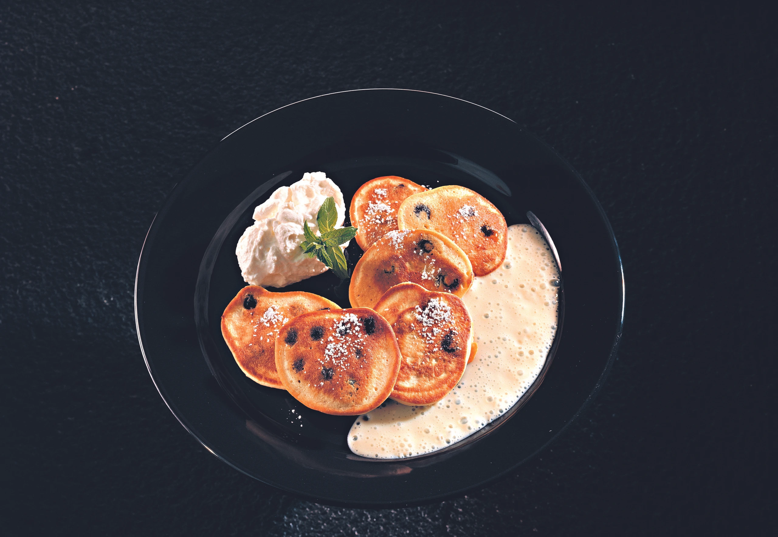Die Heidelbeerdatschi mit Mandelsauce (siehe Rezept) auf Tellern anrichten, mit Staubzucker bestreuen, mit geschlagenem Obers und Minzeblättern garnieren.