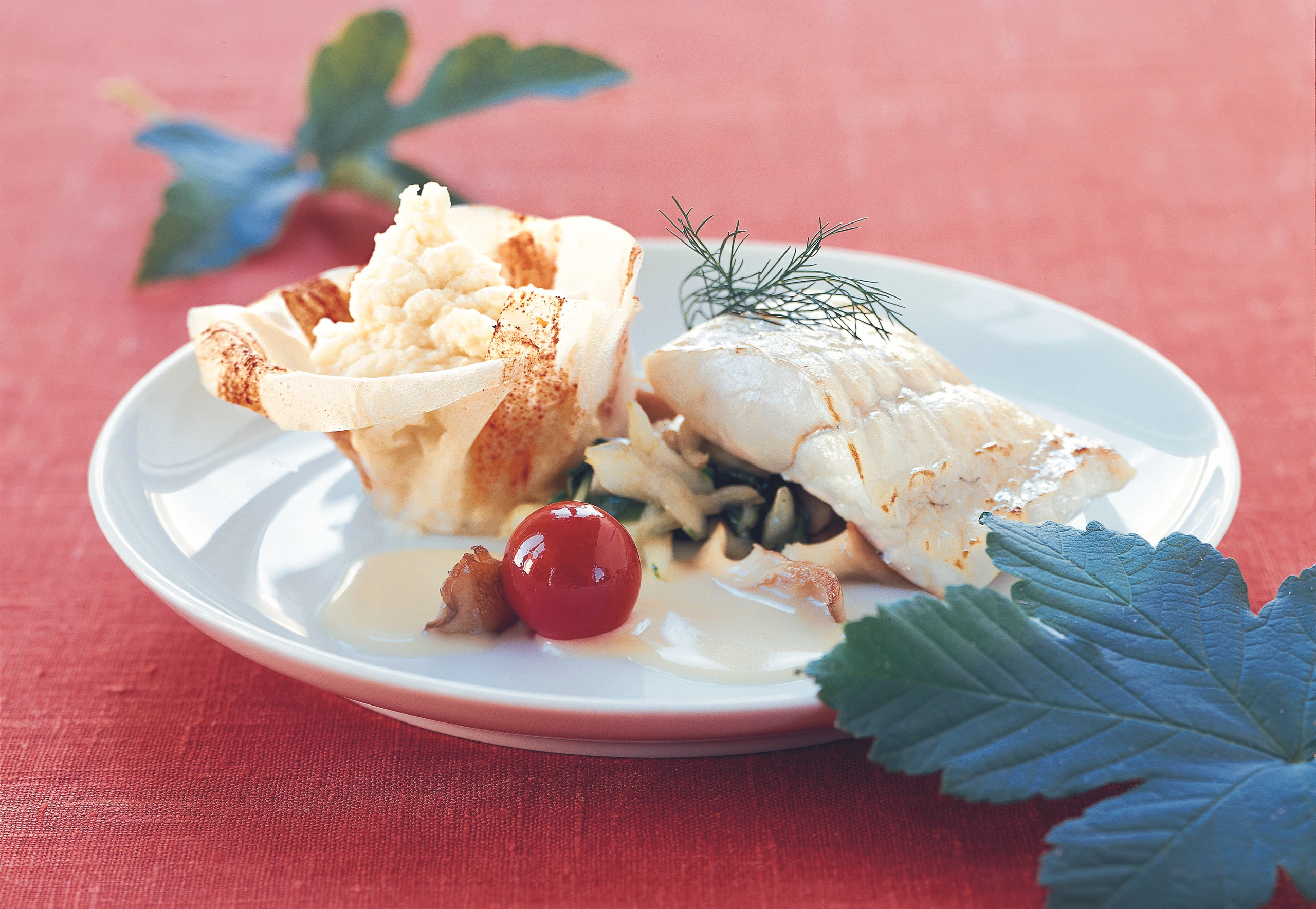 Für die Sauce Schalotten kurz in warmes Wasser legen, schälen und fein schneiden. Schalotten in Butter anschwitzen, mit Fischfond, Wein und Wermut ablöschen. Mit Salz und Cayennepfeffer würzen. Obers zugießen und cremig einkochen. Sauce vom Herd nehmen.