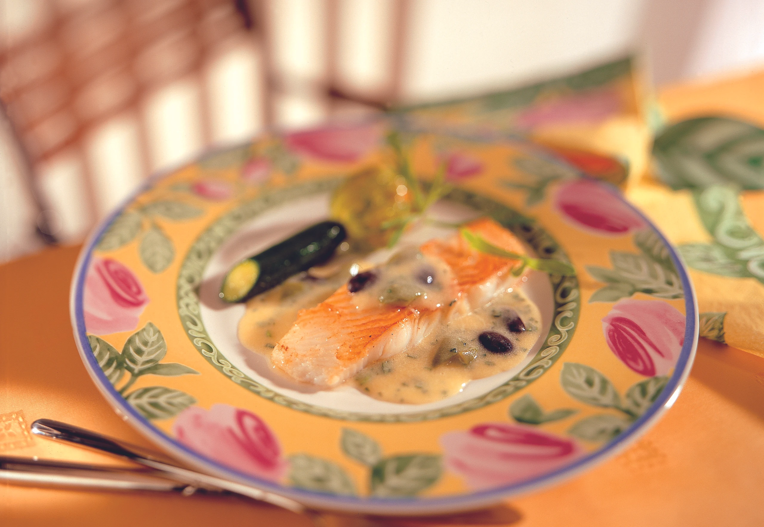 Fisch trocken tupfen, mit Salz, Pfeffer und wenig Zitronensaft würzen. Öl erhitzen, die Filets darin beidseitig braten (insgesamt ca. 1 Minute), dabei öfters mit Bratfett übergießen. Filets aus der Pfanne heben und mit der Sauce und den zuvor zubereiteten gefüllten Zucchiniblüten anrichten.