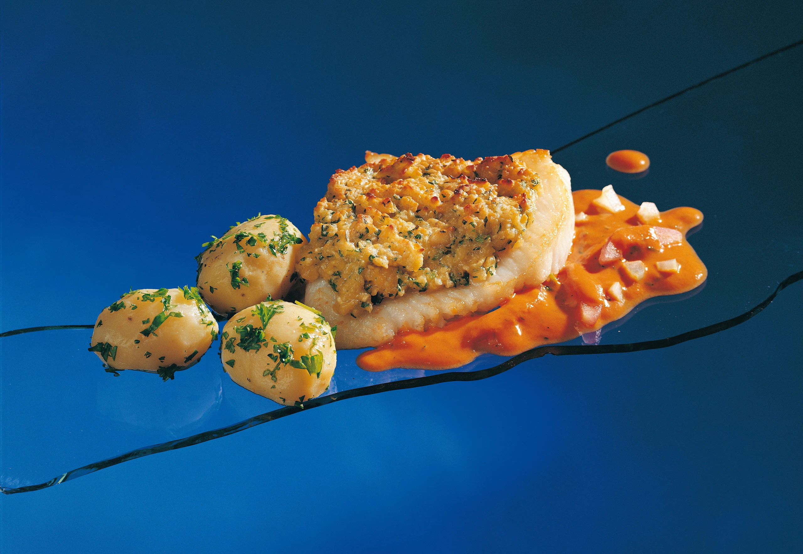 Bratrückstand mit Weißwein ablöschen und mit Paradeissaft und Obers aufgießen. Sauce cremig einkochen, Sellerie und Paradeiser untermischen und kurz mitköcheln. Fischfilets mit der Sauce anrichten. Zu den überbackenen Heilbuttfilets serviert man am besten Petersilerdäpfel.