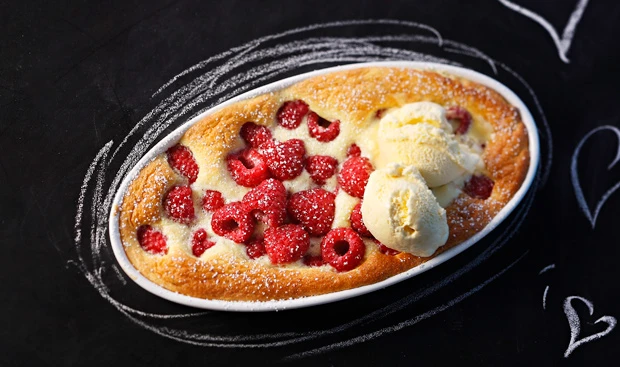 Rohr auf 180°C vorheizen. Eine flache Auflaufform (20 x 36 cm) dünn mit Butter ausstreichen, mit Mehl ausstreuen. Himbeeren mit Kokoslikör marinieren.