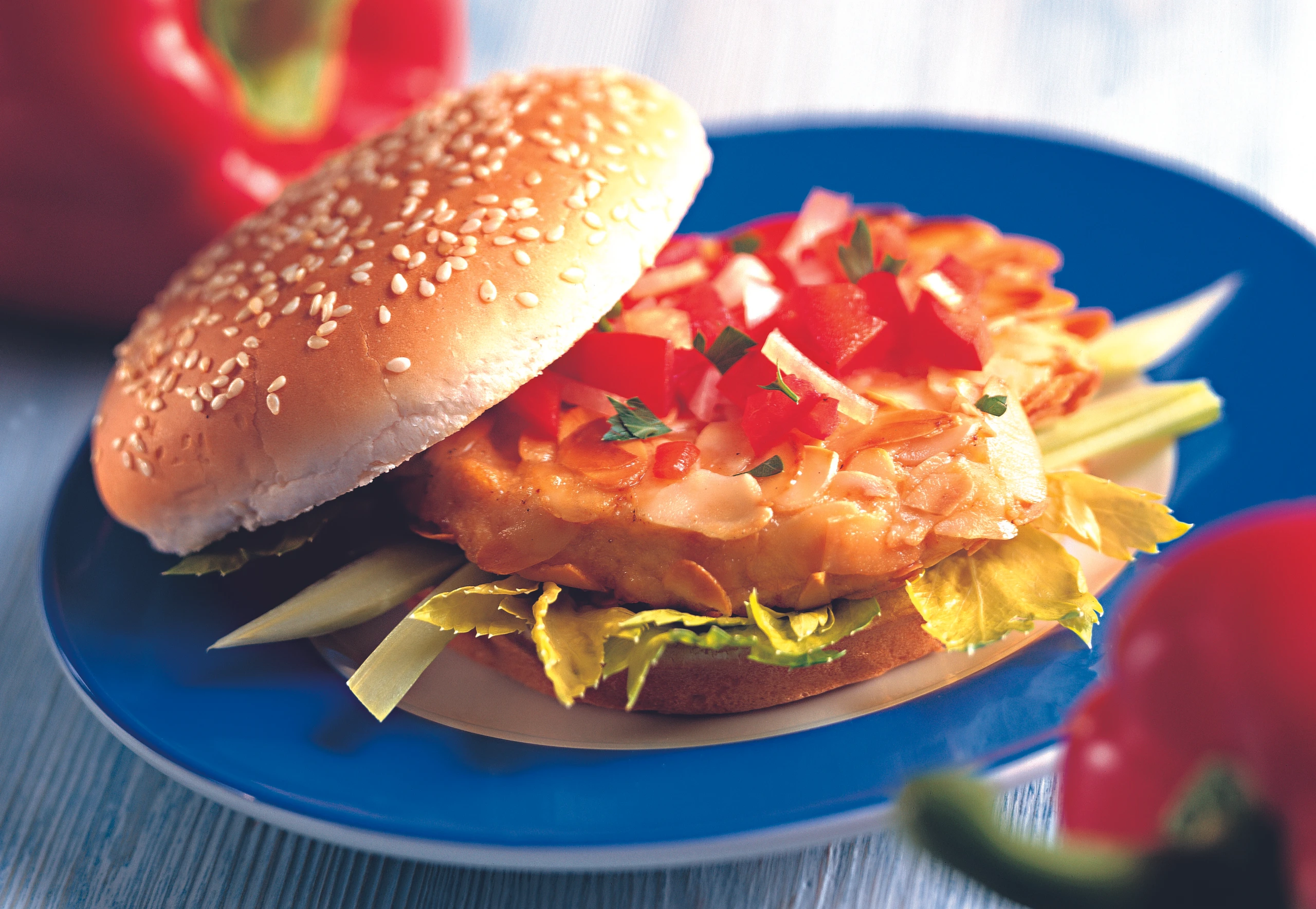 Die Laibchen durchschneiden, die Unterteile mit Selleriestreifen und je einem Hühnerfilet belegen, darauf die Salsa verteilen, Deckel darauflegen.