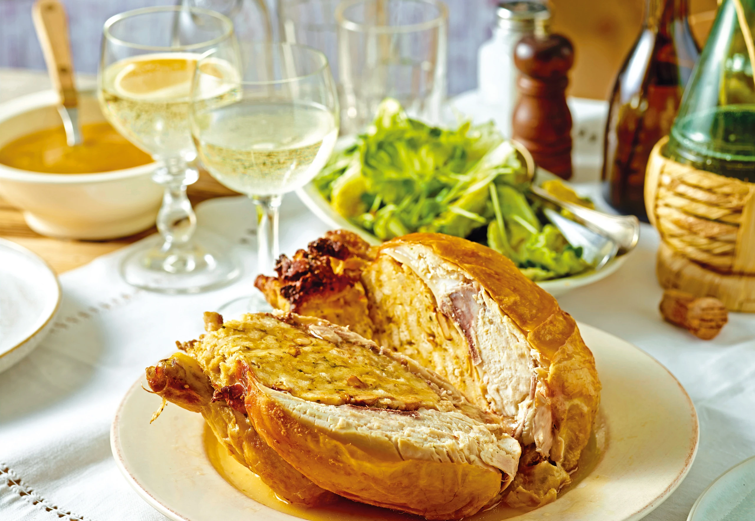 Hendl herausnehmen und kurz rasten lassen. Bratensaft abseihen und auf ca. zwei Drittel der ursprünglichen Menge einkochen. Spagat entfernen, Hendl tranchieren, mit Fülle und Saft anrichten und mit dem Salat servieren.