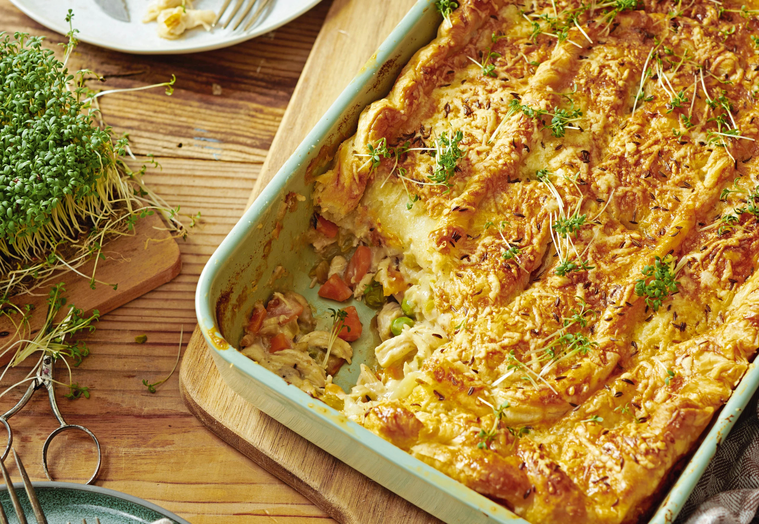 Masse in die Form füllen. Blätterteig aufrollen, auf die Form legen und den Rand dekorativ einschlagen. Teig mit einem Messer mittig einschneiden, damit beim Backen der Dampf entweichen kann.