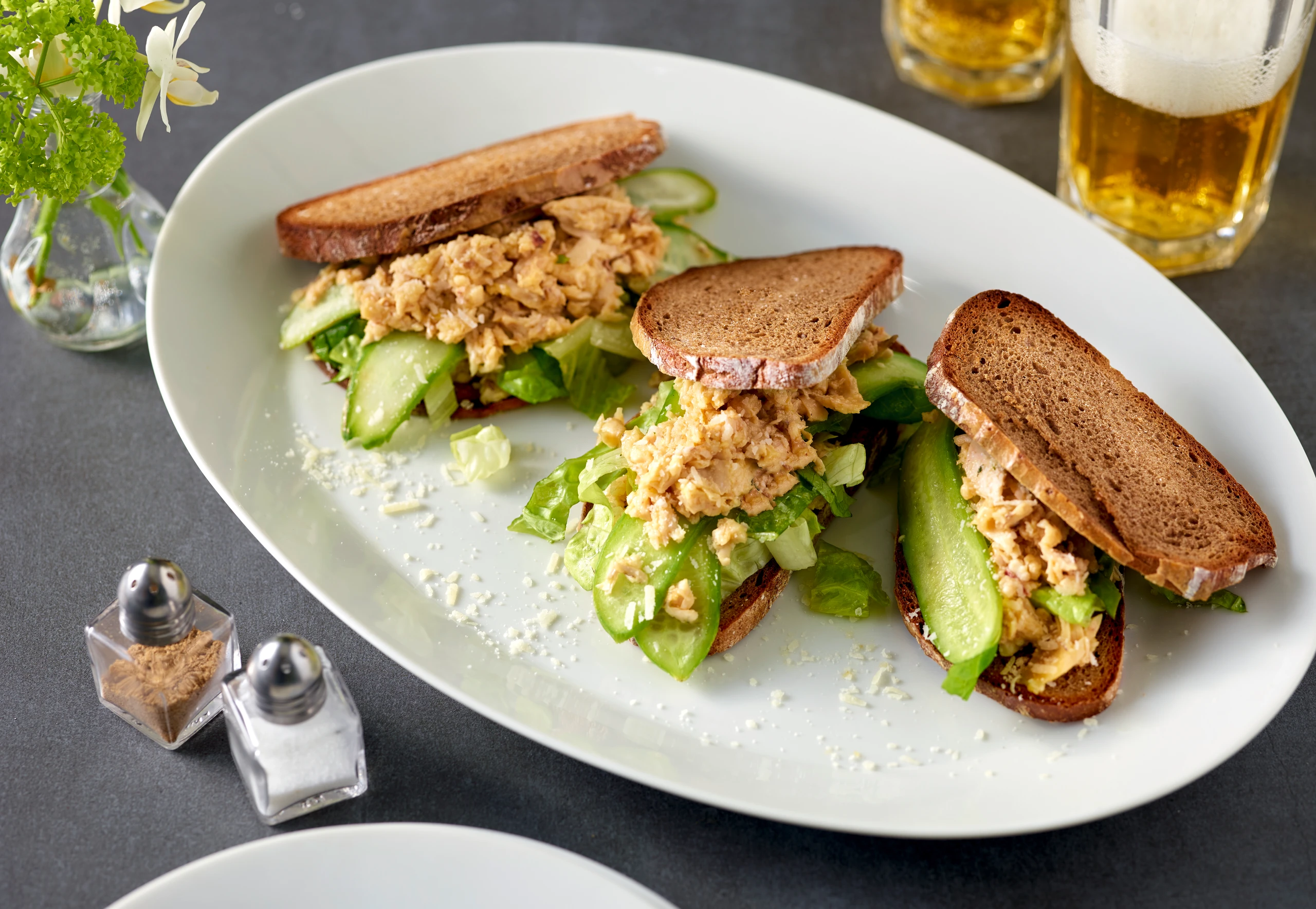 Auf der Hälfte der Brote die Salatstreifen verteilen und mit den Gurkenscheiben belegen. Darauf den Hühnersalat anrichten und mit Parmesan bestreuen. Übrige Brote darauf legen.